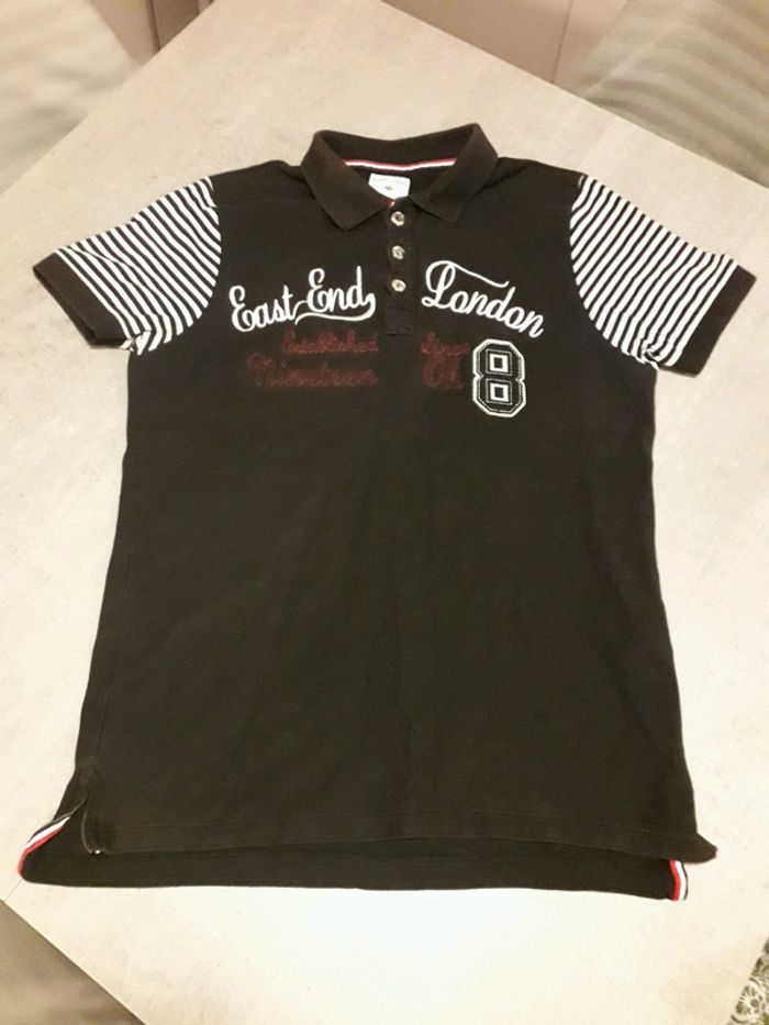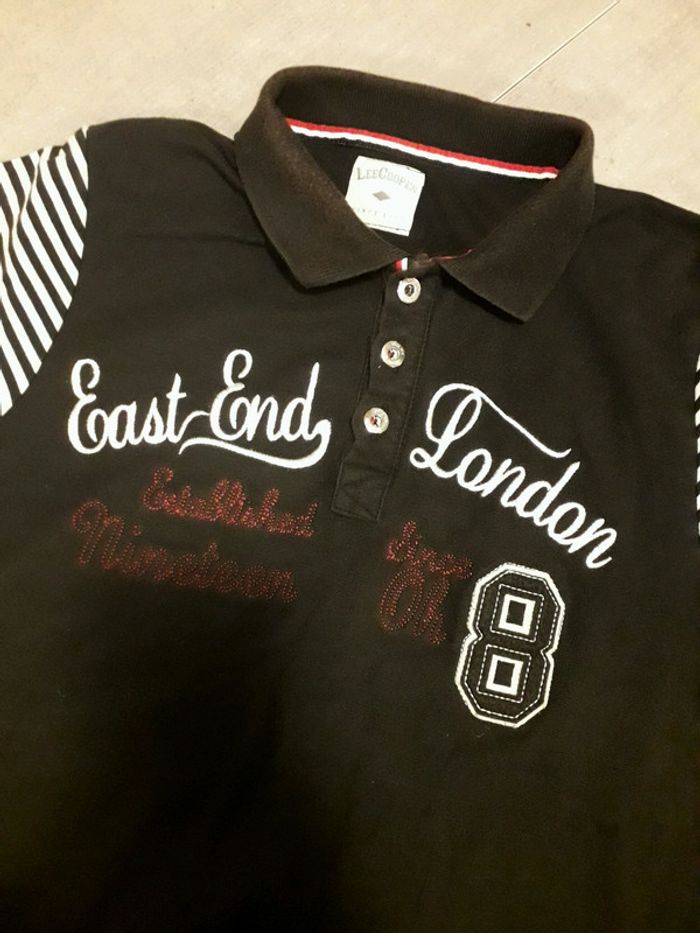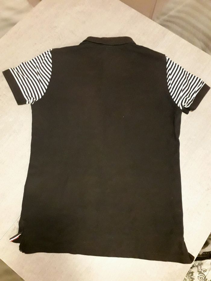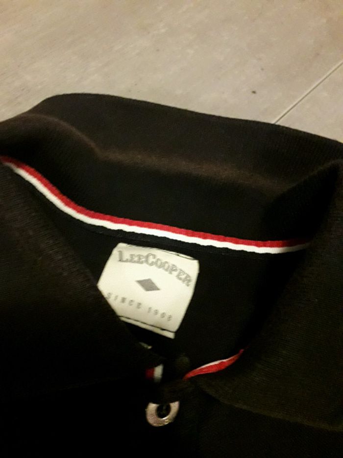 Polo Lee Cooper taille M manches courtes noir avec motifs blancs et rouge. Manches rayées noires et blanches. Délavé au niveau du pli du col (cf dernière photo).