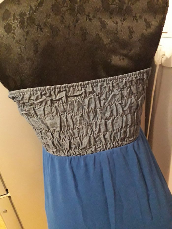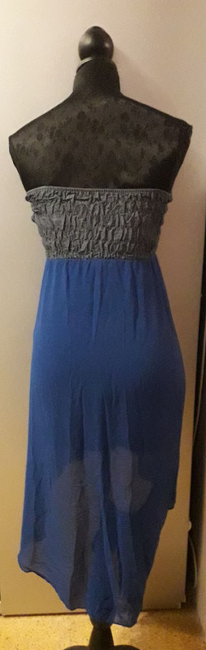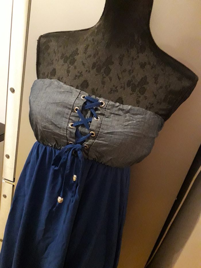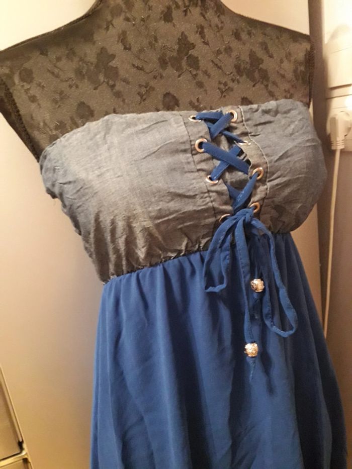 Robe de soirée de couleur bleu électrique et effet jean's sans bretelles, taille unique correspondant tout de même à un 36/38. Asymétrique, doublure assez courte. Rembourage au niveau de la poitrine avec un ruban permettant de faire un noeud.
