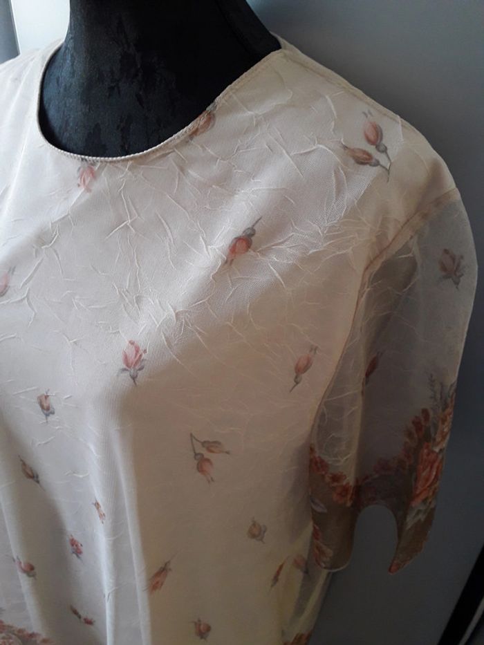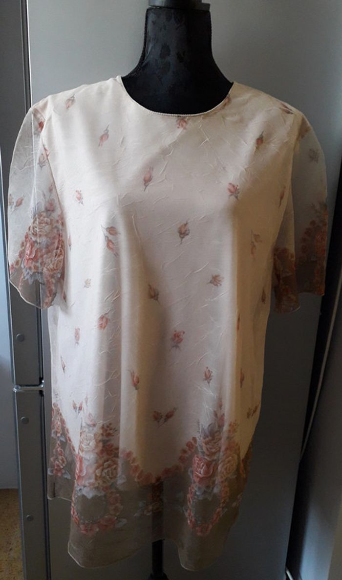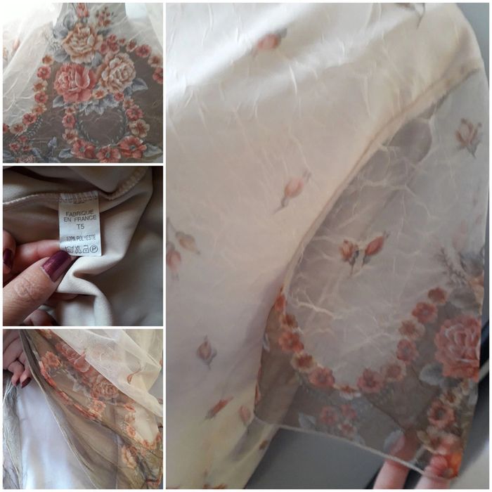 Très beau chemisier beige avec motifs fleuris. Fabrication Française, taille 5. Doublure beige.