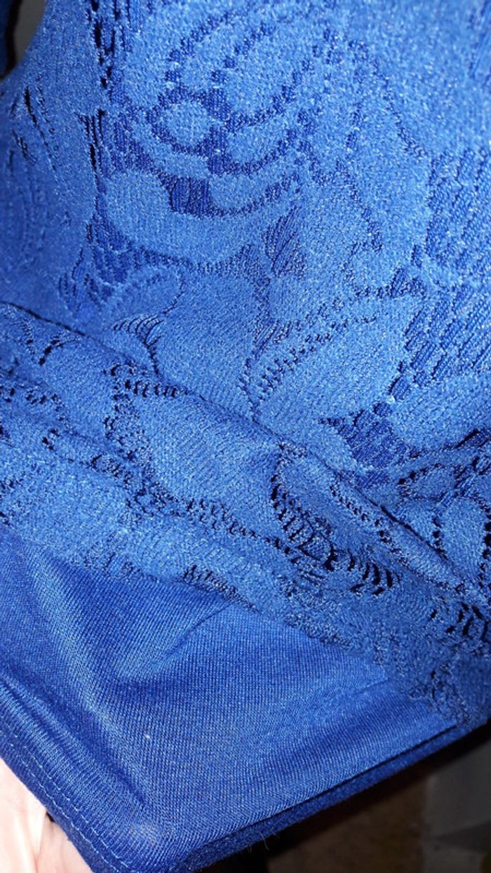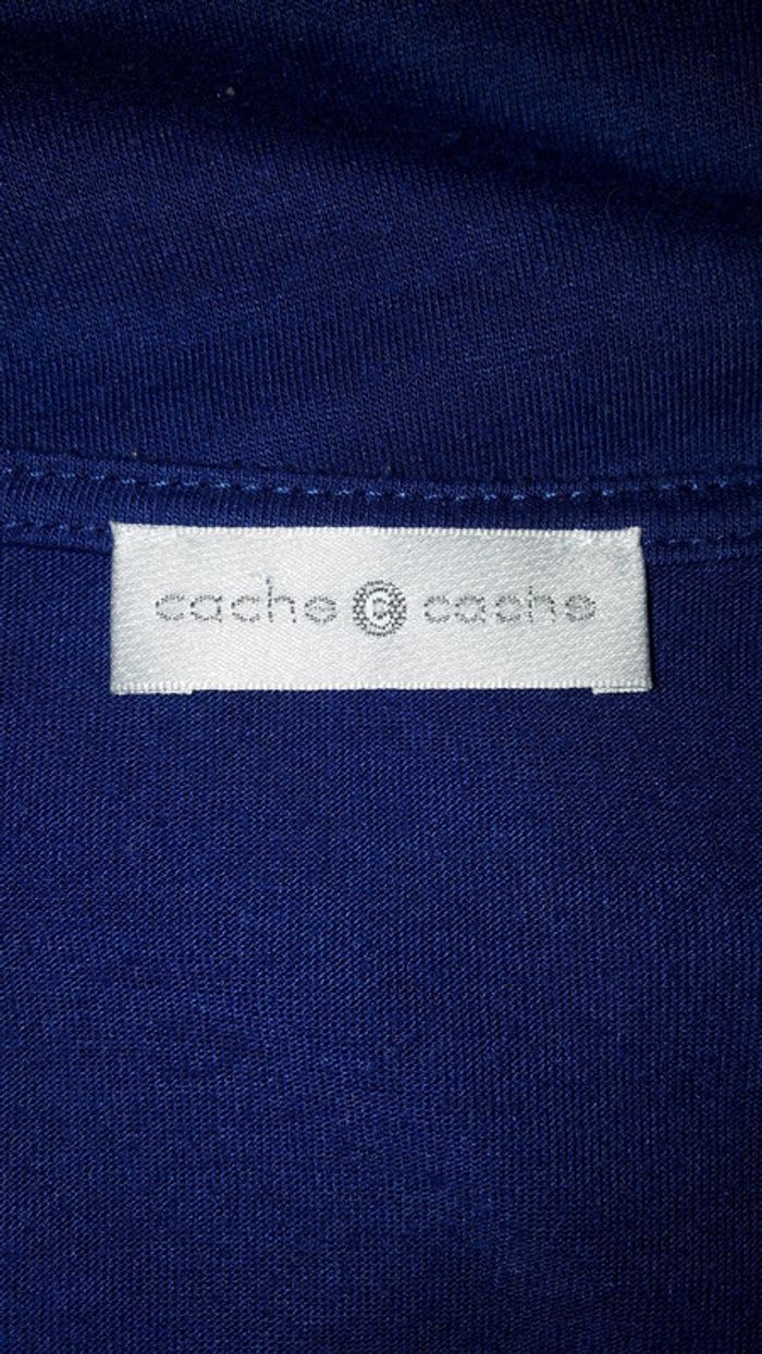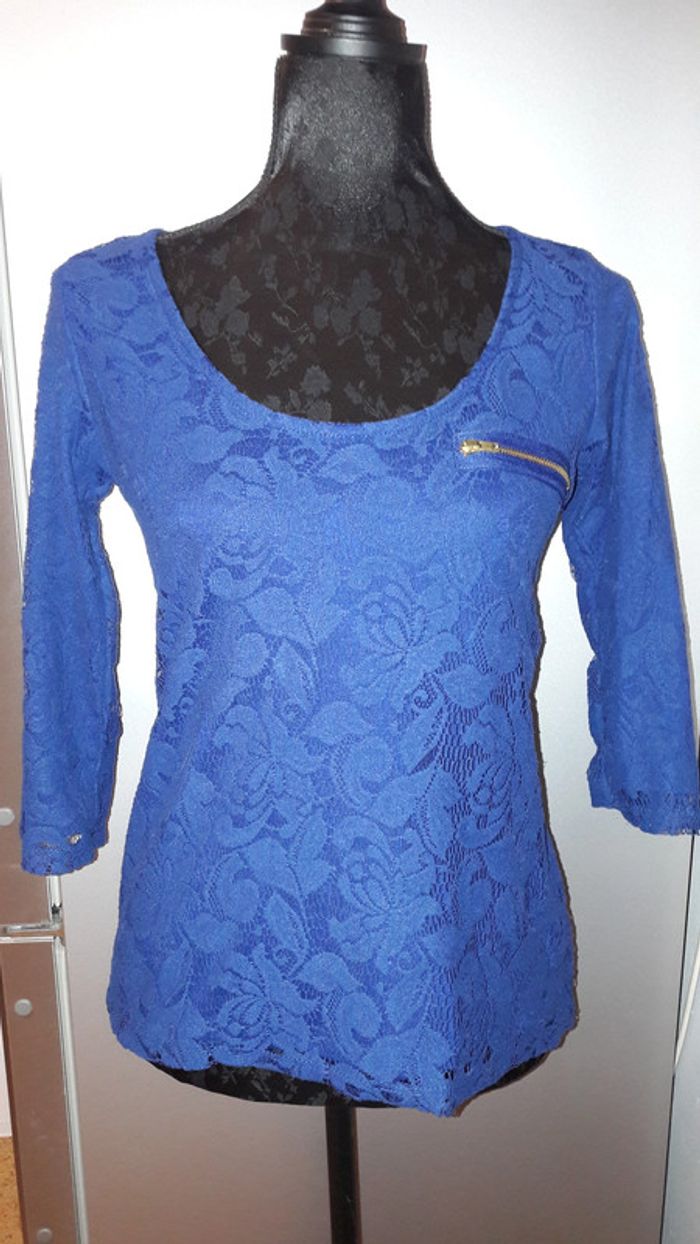 Tee-shirt manches trois quarts de couleur bleu marine, taille 36, de la marque Cache Cache, col rond. Tissu en dentelles, doublures sous la dentelle.