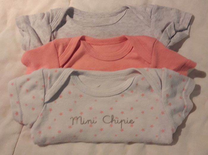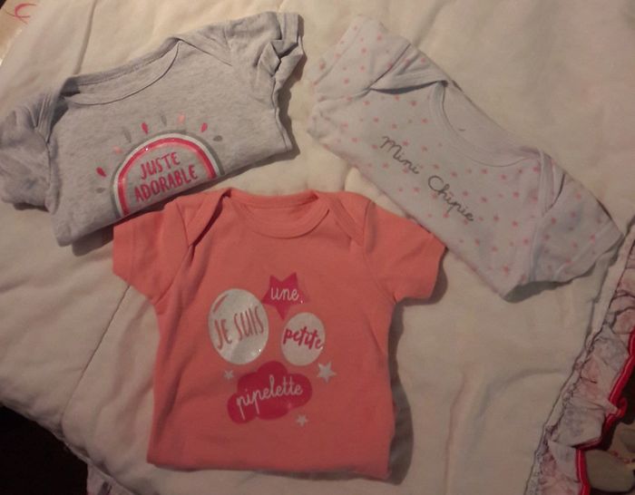 Lot 3 bodies de la marque Gémo, taille 9 mois pour filles. Un rose avec motifs blanc et texte, un blanc avec des écritures et des étoiles rose et un gris avec motifs et texte rose.
