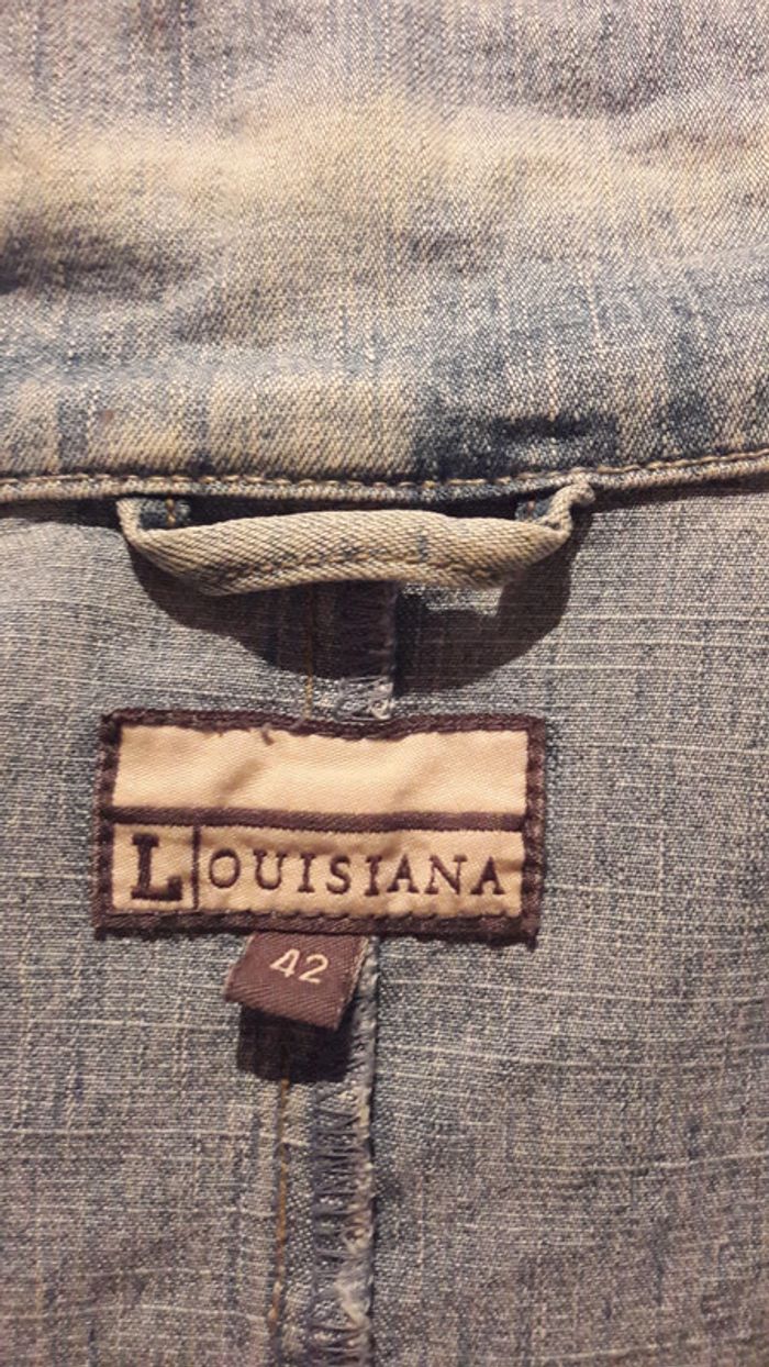 Veste en jean's taille 42 de la marque Louisiana, légèrement cintrée. Juste légèrement délavée à l'intérieur, au niveau du pli du col (cf photo).