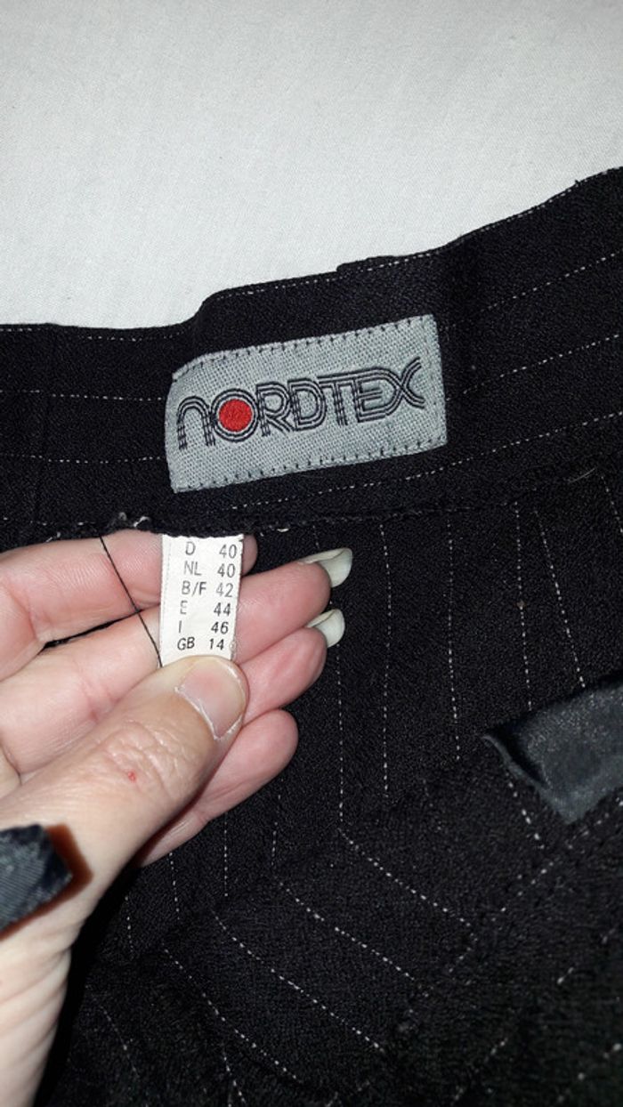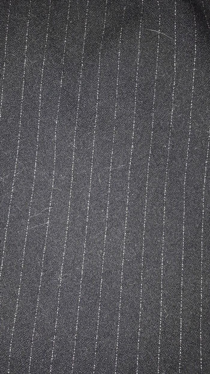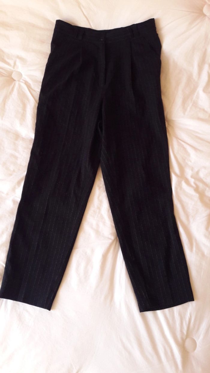 Pantalon tailleur noir rayé argenté, fines rayures, taille 42.