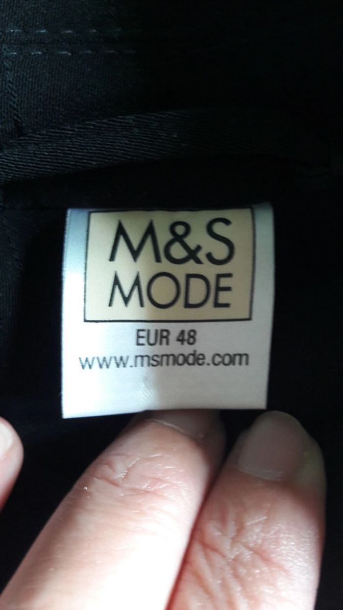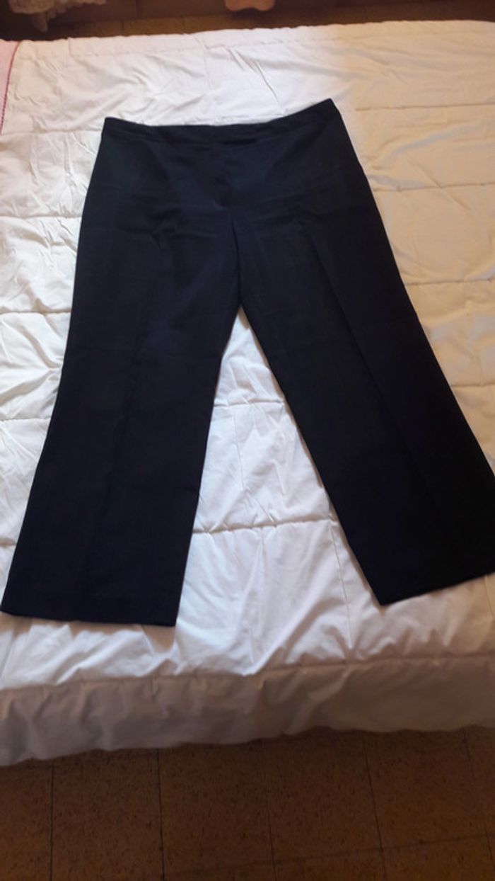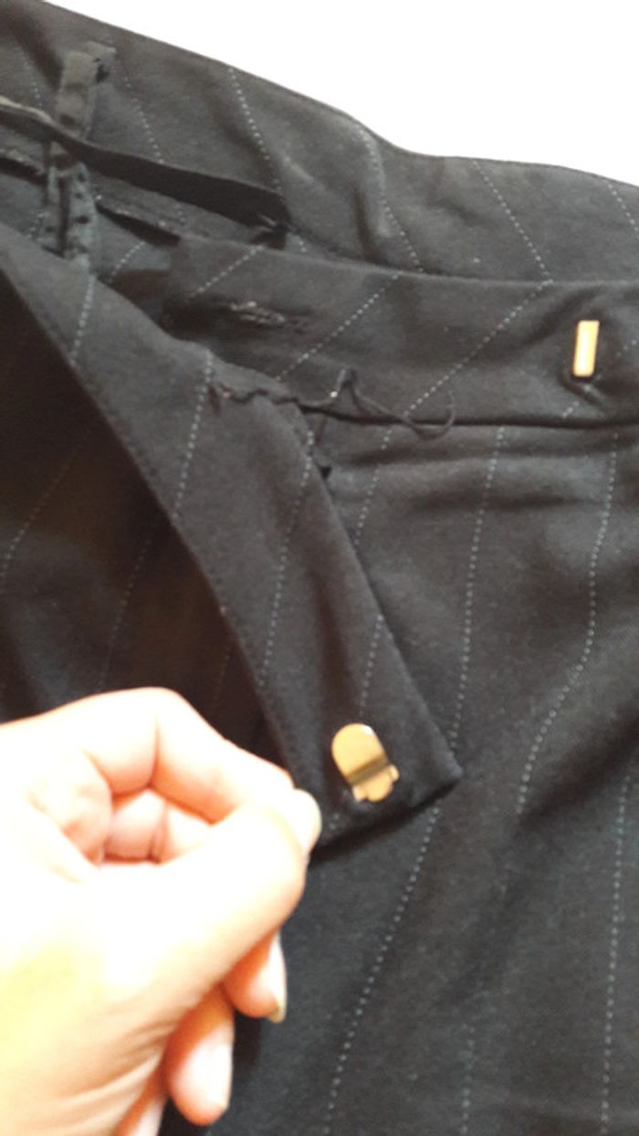 Veste tailleur femme noire avec épaulettes, taille 48, 2 boutons. Finition avec des traits brodés (présence de quelques accros : cf photo). Pantalon assorti, taille 50, manque le bouton à la taille (cf photo).