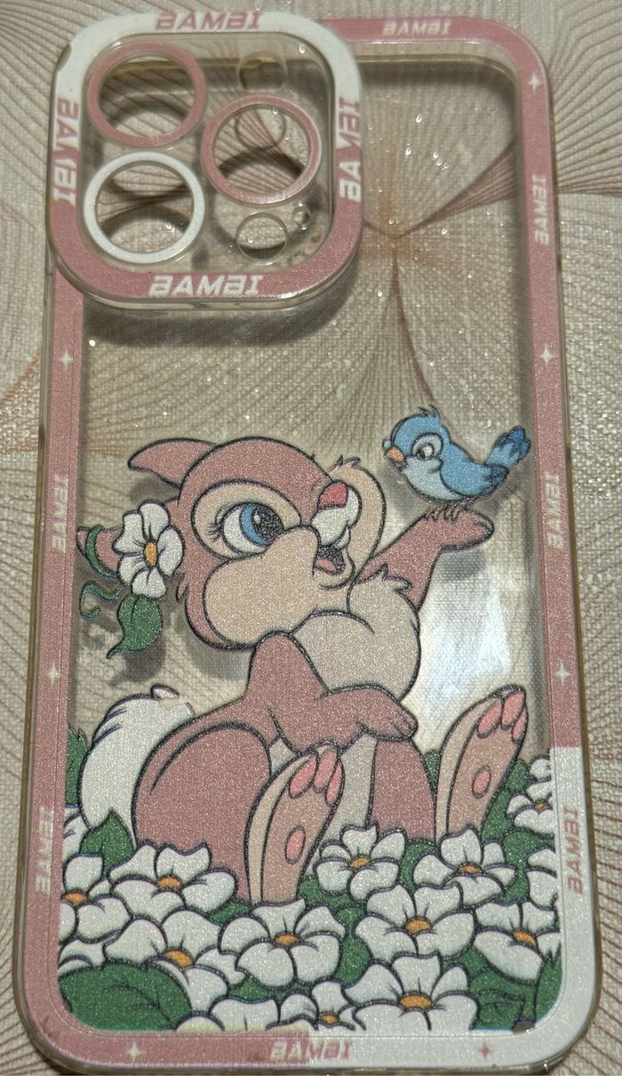 Lot de trois coques pour IPhone 13 Pro. Motifs Panpan Bambi. Nieves jamais utilisées. Une coque rose offerte lors de l’achat.