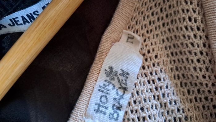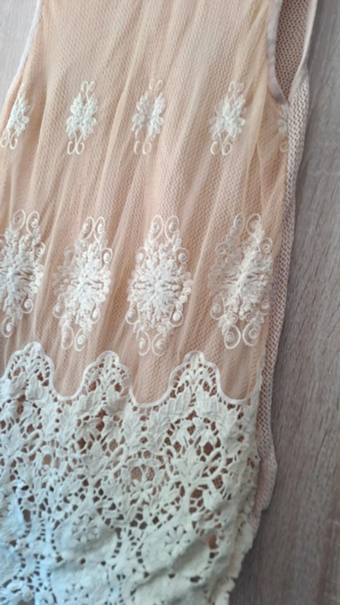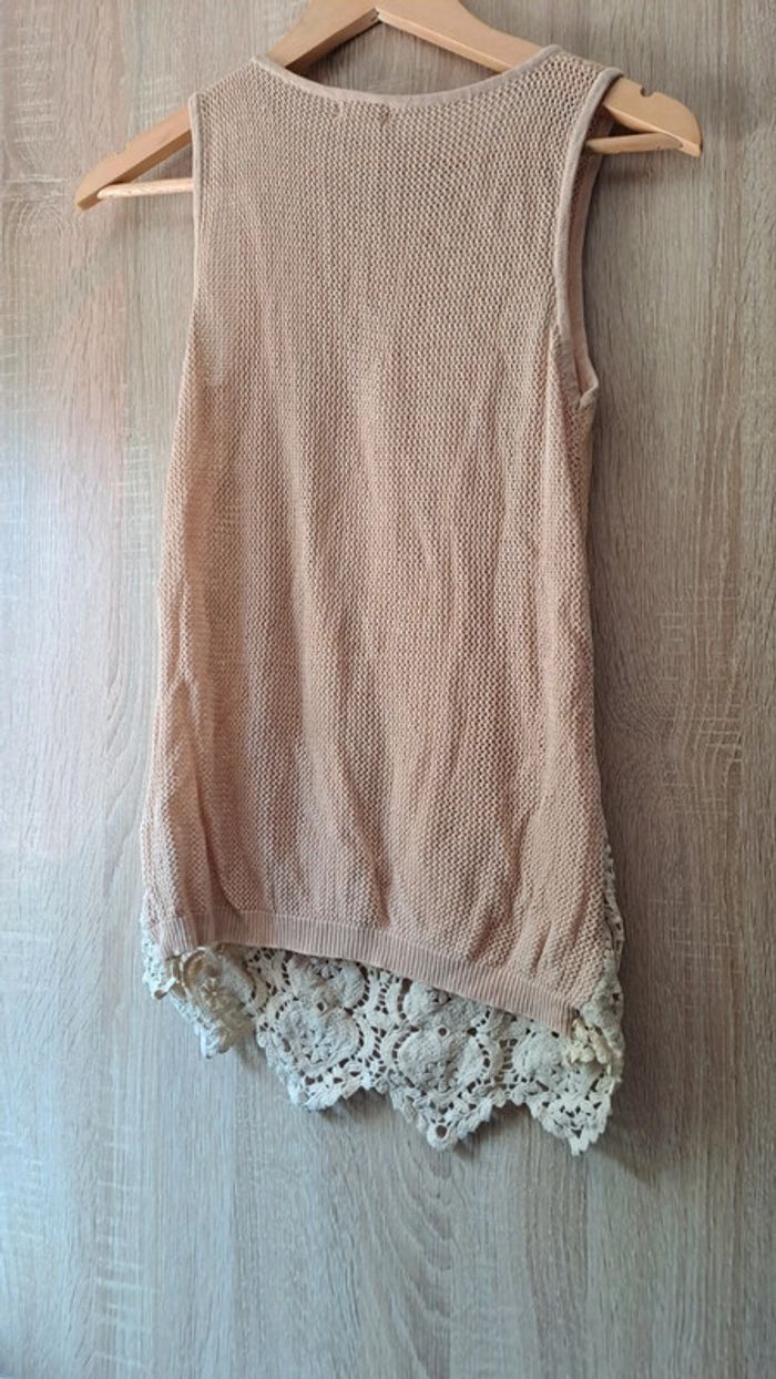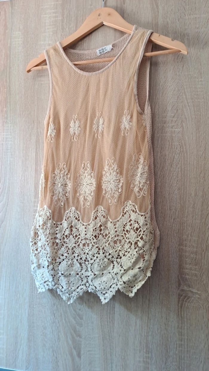 Blouse sans manche en treillis et dentelle. Doublée à l avant. Taille unique. Couleur rose saumon. Très bon état. Matière élastique.