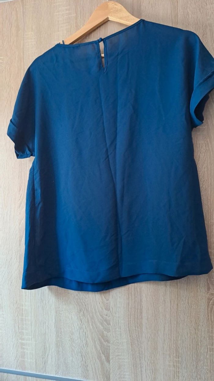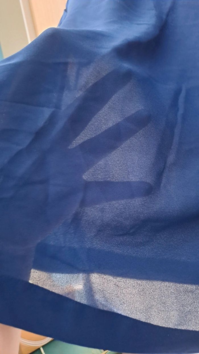 Blouse en voile transparent. Couleur bleu marine bleu bic. Bouton dans le dos. Très bon état. Taille M