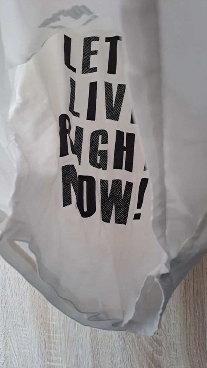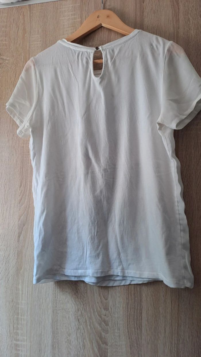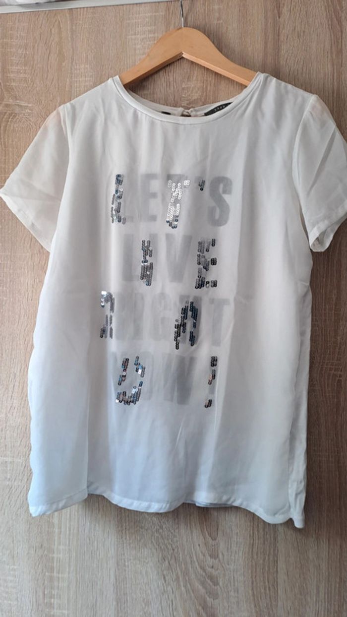 T shirt blanc Esprit. Matière t shirt avec inscription. Il y a un voile avec strass par dessus. Bouton dans le dos. Très bon état. Taille M Belgique. Taille L France