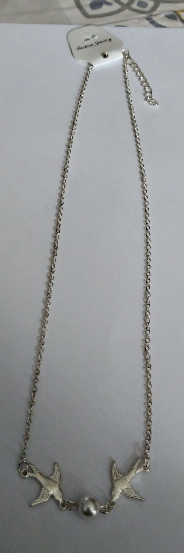 Collier avec 2 hirondelles + perle. Longueur : 50 cms. Dimensions du pendentif : 5,7x1,7 cms. N'hésitez pas à regarder mes autres ventes. Envoi rapide et soigné.