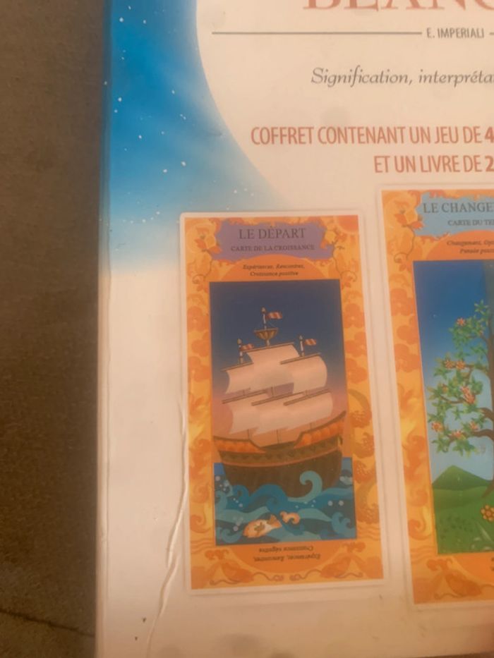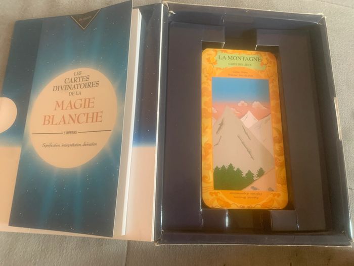 Coffret contenant un jeu de 40 cartes grand format et un livre de 216 pages Le coffret est abimé, plié Pliures sur la couverture du livre sinon intérieur nickel Cartes nickel