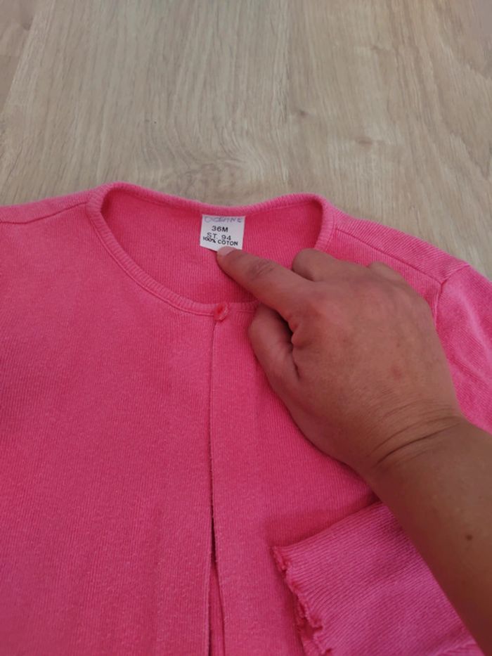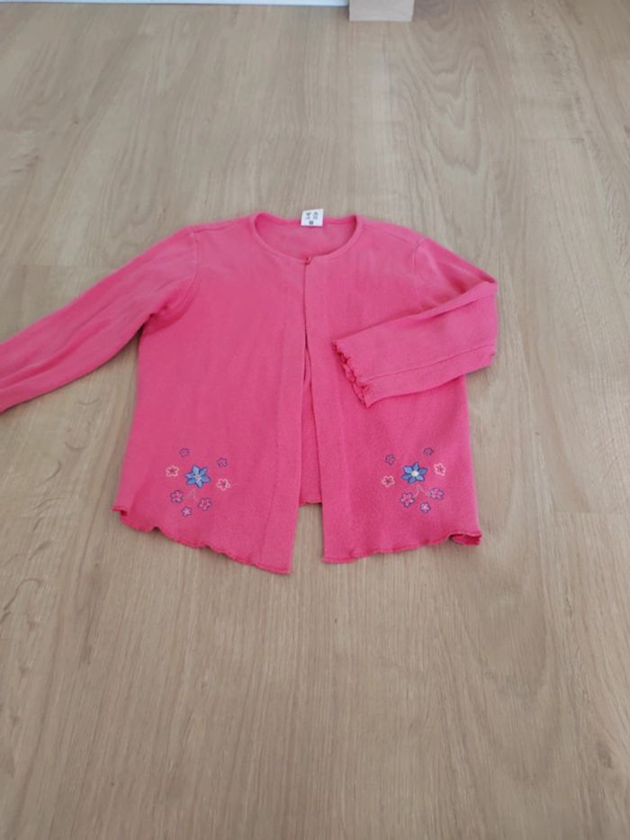 Lot de deux gilets Le rouge plutôt gilet court avec détails pailletés au nouveau du col, manches etc Fermeture par boutons Le rose, plus long avec broderie fleurs Fermeture par un seul bouton en haut
