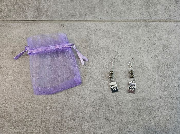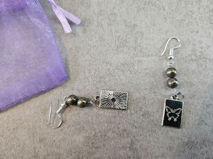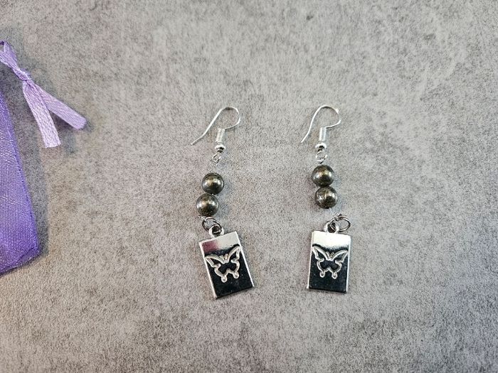 Boucles d'oreilles papillons et hématites Neuf sans étiquette Artisanat Belge Lithothérapie Pierres authentiques Vendu avec pochette Envoi soigné