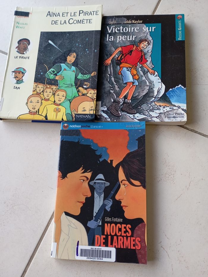 Lot de 3 livres poches pour les ado 12 ans et plus très bon état Noces de larmes de gilles fontaine chez Nathan poche Victoire sur la peur de phillys Reynolds Naylor chez castor poche Flammarion Et Aïna et le pirate de la comète de Christian grenier chez Nathan Acheté ds une bibliothèque
