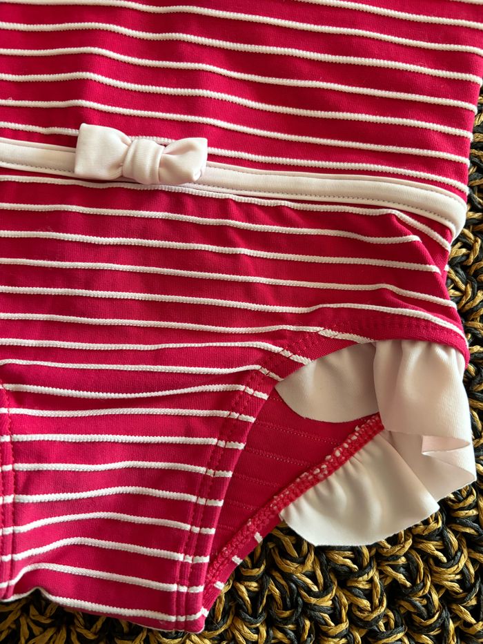 Superbe maillot de bain bébé bordeaux et beige. Pas d’étiquette mais taille 3-6 mois. Très bon état