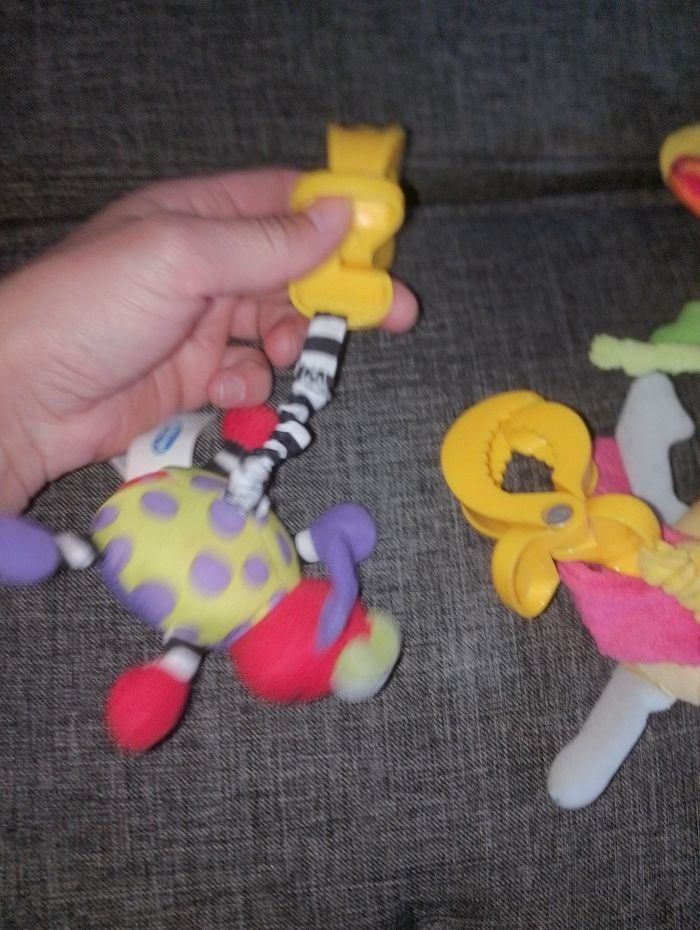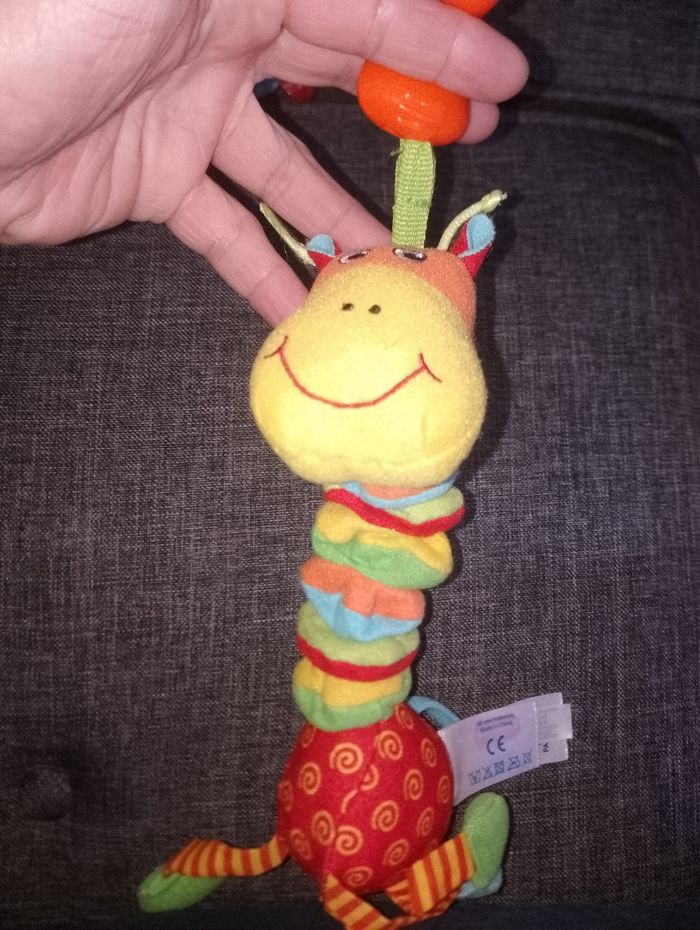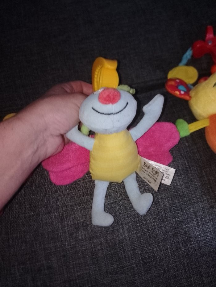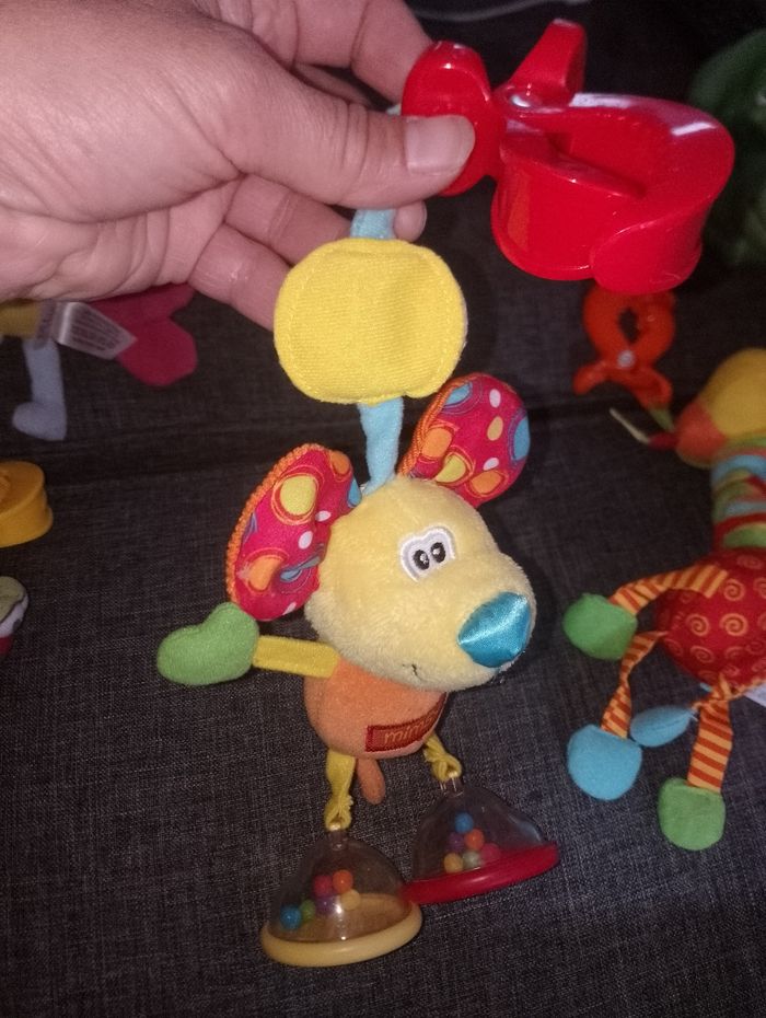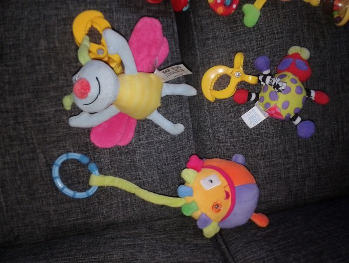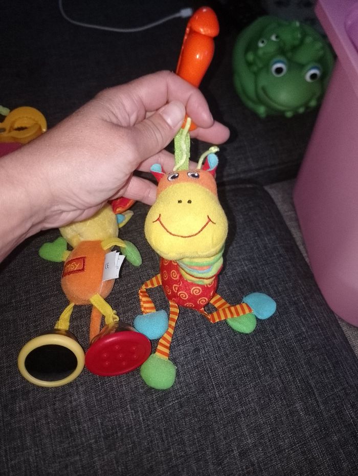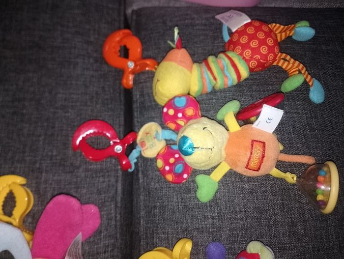 Différents jeux éducatifs bébé 12€ pièce Suspension avec pince et qui vibre en tirant dessus - moustiques libellule bleu et rose taf toysun - coccinelle violet vert et rouge playgro - girafe jaune orange et rouge Tiny love - extraterrestre jaune violet orange avec anneau vibre 2 seconde ( à réparé) baby Sun # suspension souris mimsy avec ses pieds qui font du bruit (billes a l'intérieur)