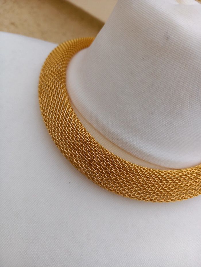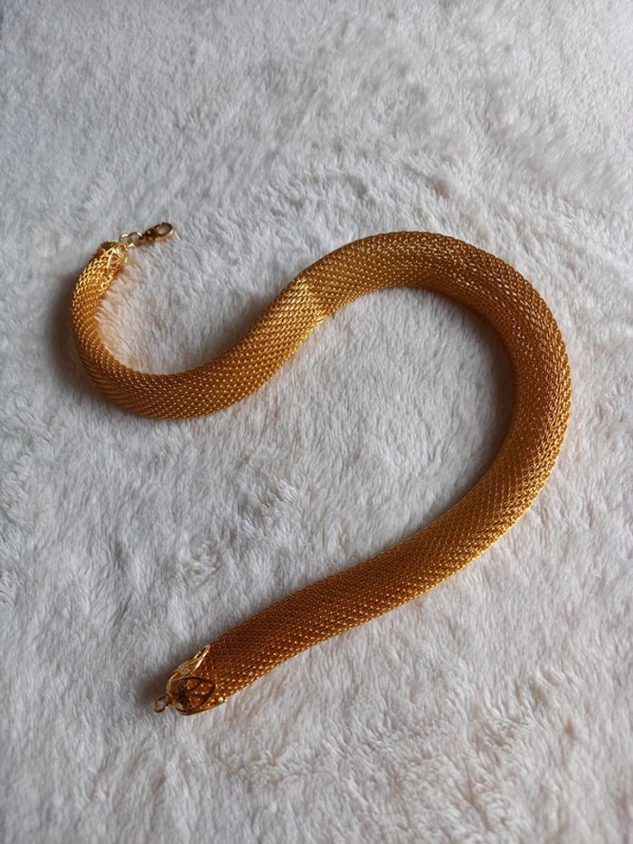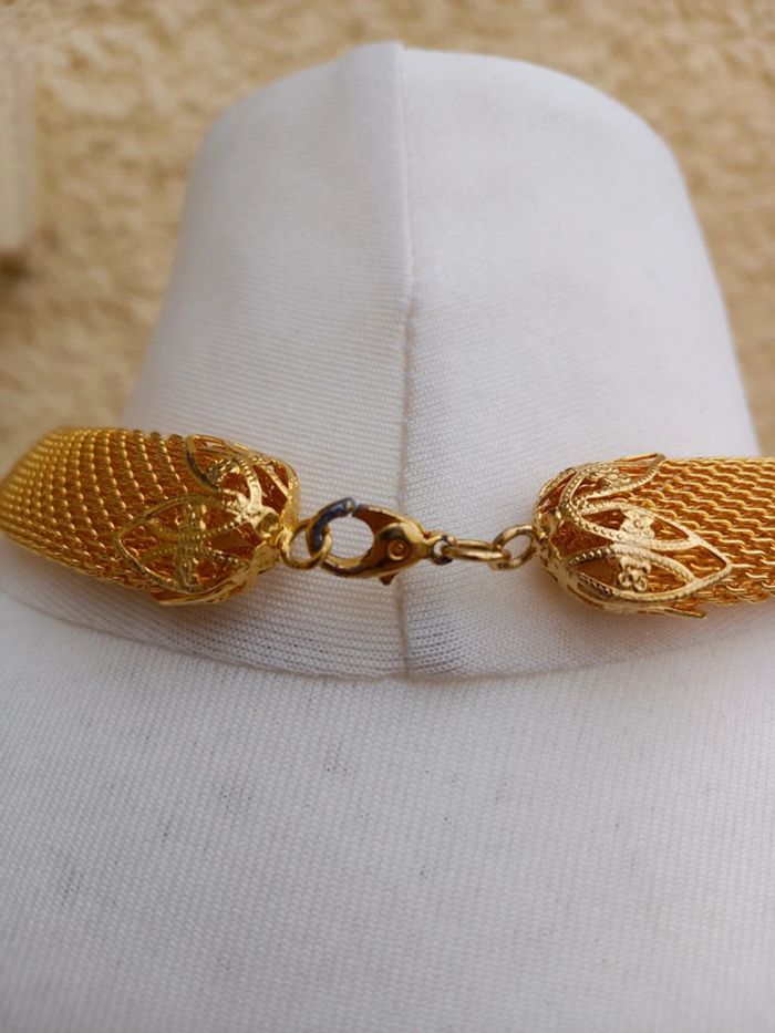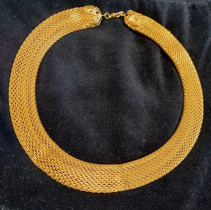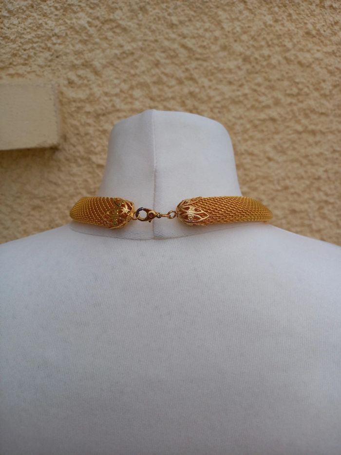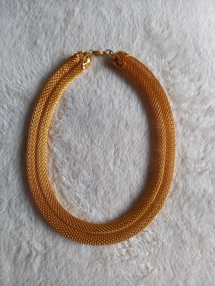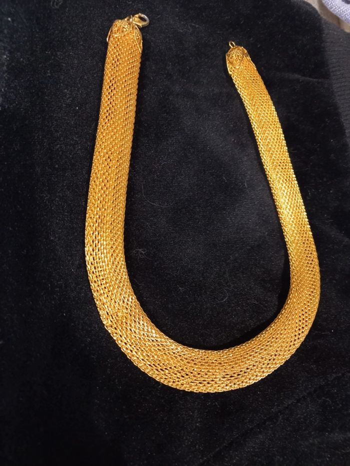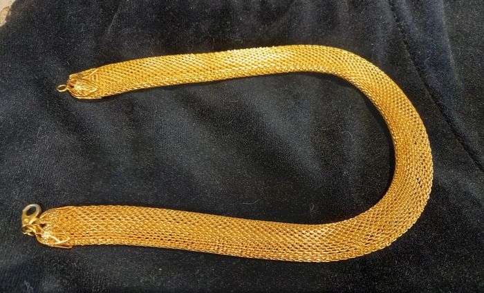 Collier ras de cou Maillons dorés ( pincés à 1 endroit ) Longueur 42 cm Le fermoir à perdu un peu de dorure,2 pliures. La couleur réelle est celle des premières photos (jaune d'or) manque de luminosité sur les autres photos Bon état #linejacbijouxfantaisie