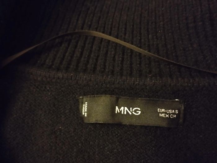 Pull marin noir et blanc en maille fine. Coupe droite. Col polo Toujours en vente sur le site de la marque 50% VISCOSE. 28% POLYESTER. 22% POLYAMIDE. (étiquette de composition coupée) Porté 1 fois Mango taille S