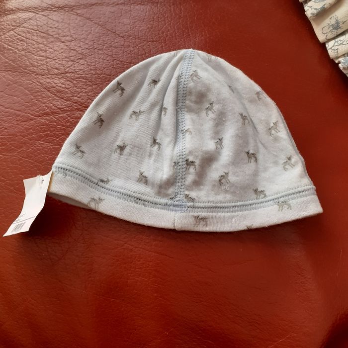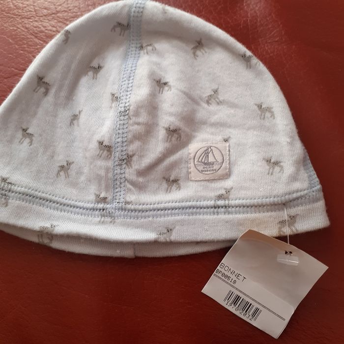 Article Neuf,encore étiqueté, marque Petit Bateau : Bonnet 100% coton; taille 6 mois; surpiqûres apparentes; motifs "Petites Biches" grises; fond bleu pastel. Intérieur avec rayures. Lavable à 30°. Logo devant // voir photos pour détails