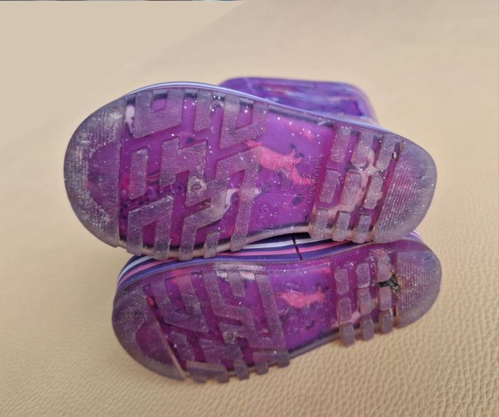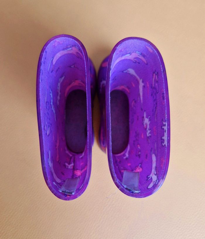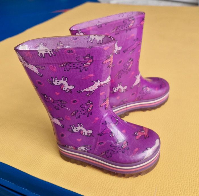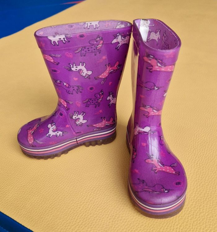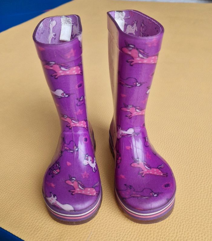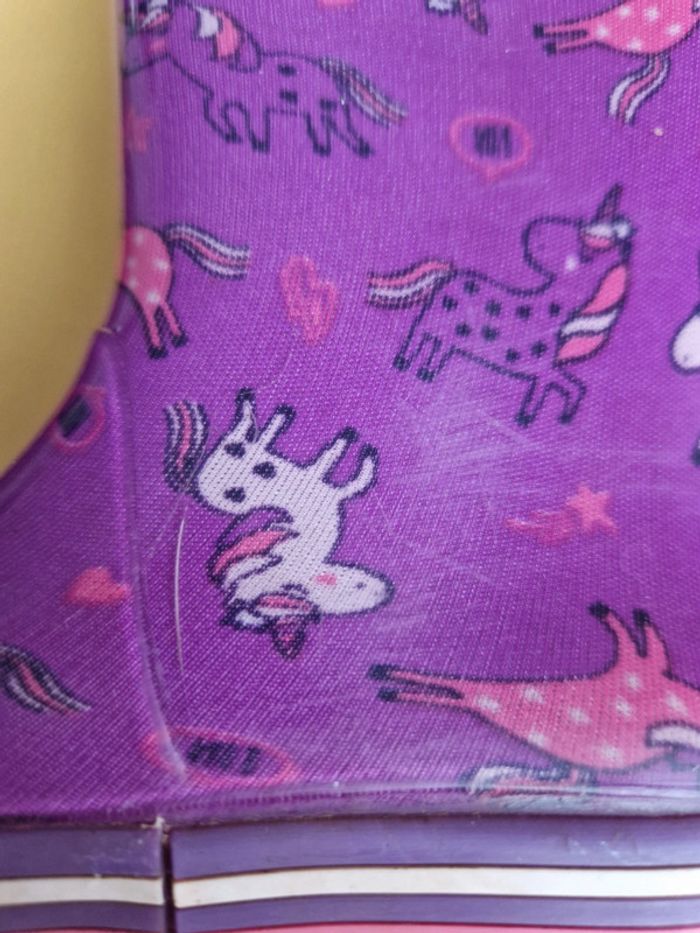 Bottes de pluie, fushia-violet. Motifs licornes, étoiles, éclair. Très bon état, quelques petites rayures, cf zoom de la derniere photos.