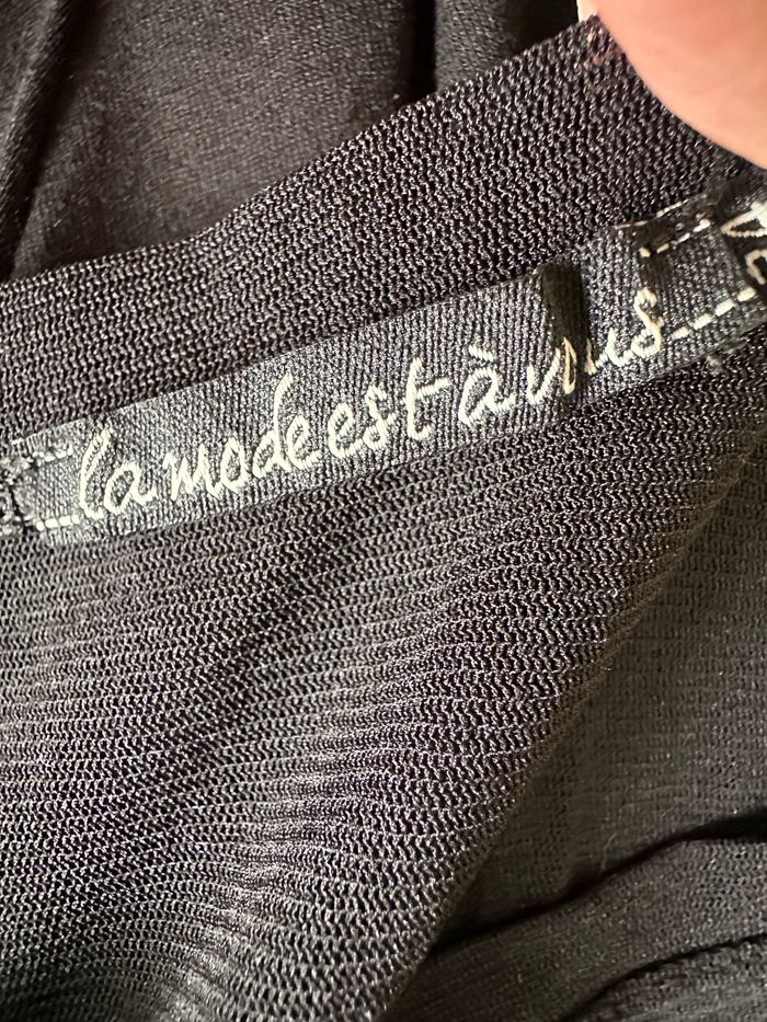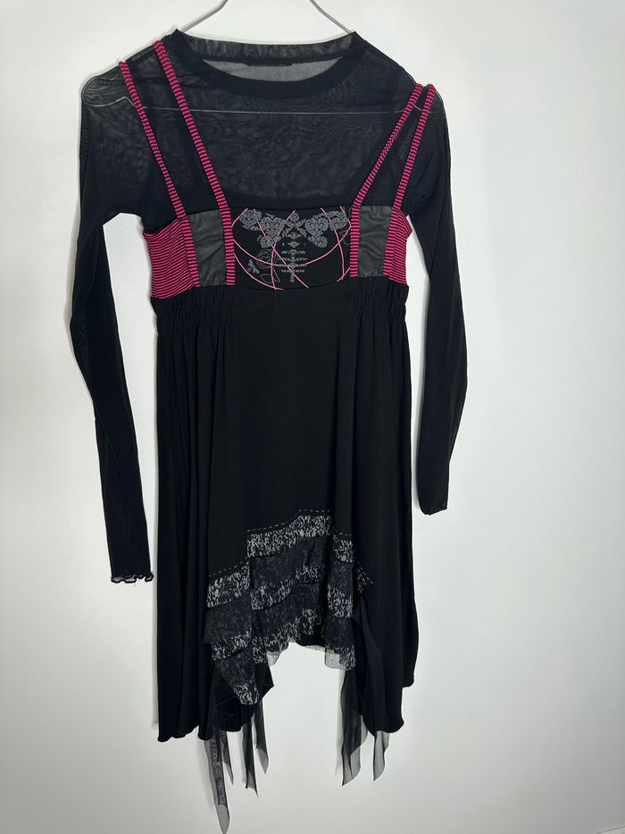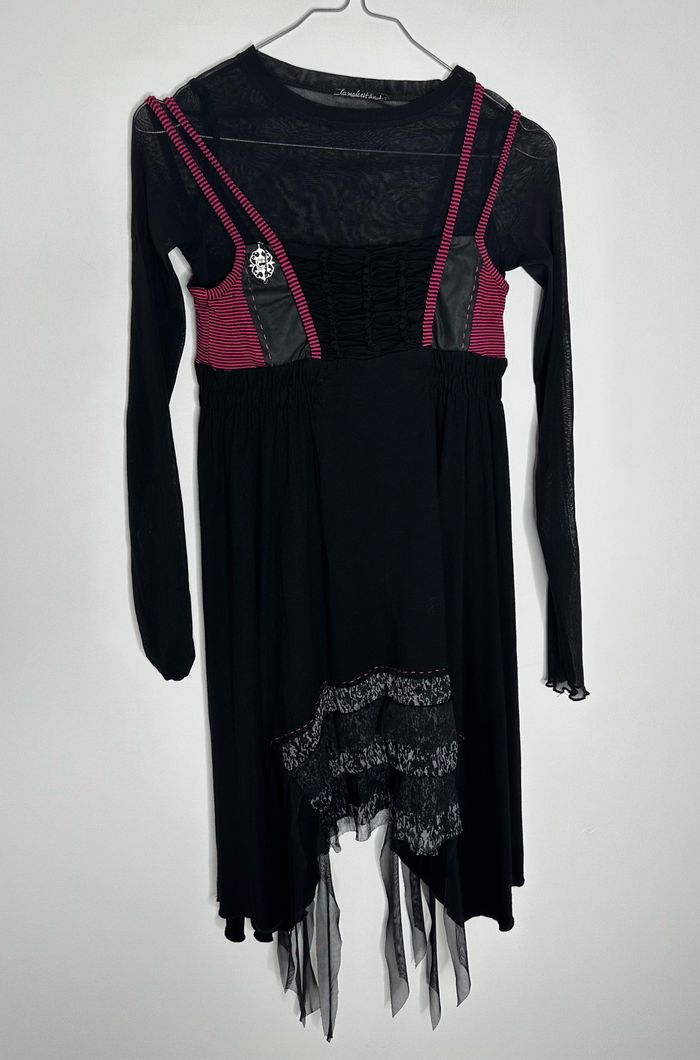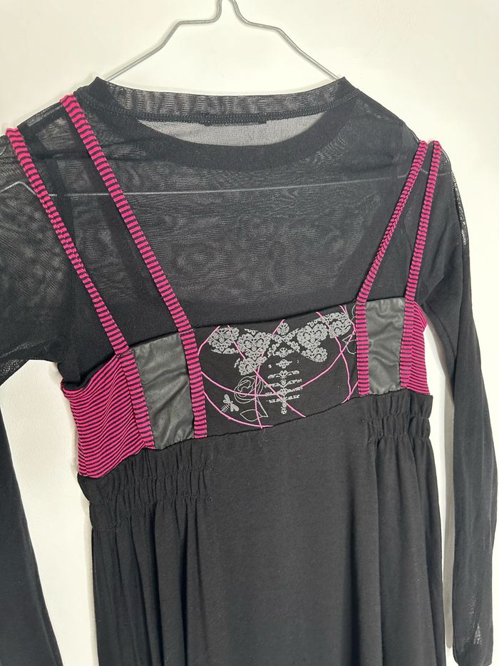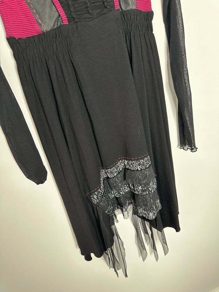 Robe bariolée - Excellent état - Taille 34 équivalent XS - La mode est à vous - Noire et rose fuchsia - Haut en mesh - Coupe asymétrique - Tissus bariolé avec empiècements - Viscose, élastane, coton et polyester