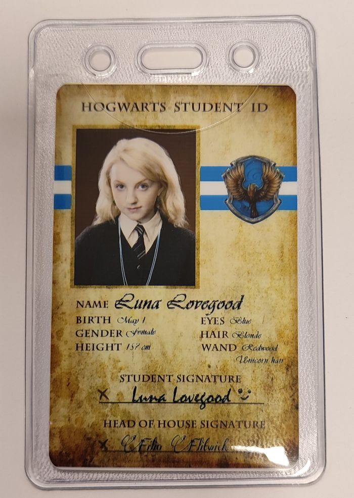 Badge de Luna Lovegood des films Harry Potter Taille : 8.6 cm / 5.4 cm Matière : PVC Recto