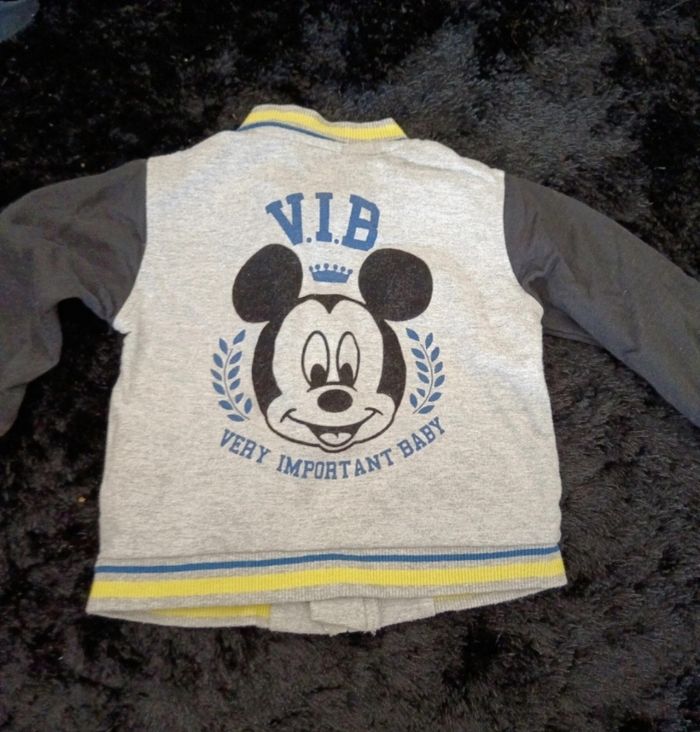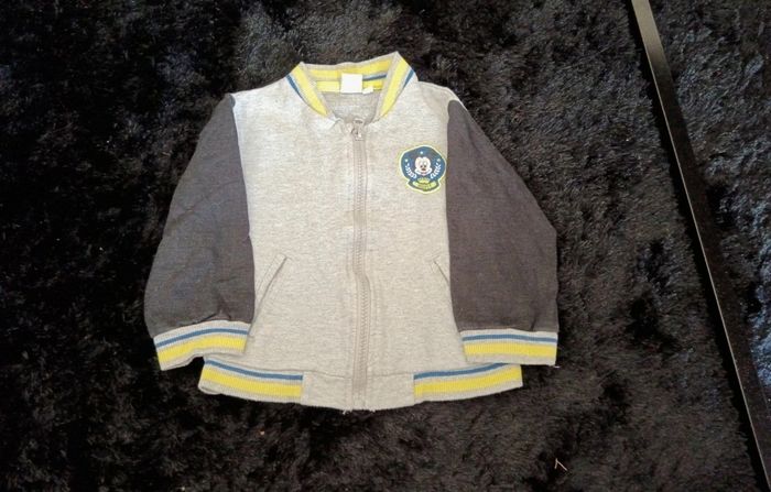 Veste Mickey 18 mois Le petit Mickey du devant et un peu abîmé avec les lavage Et une légère tâche sur une des poches voir 3 ème photo et d'où le prix