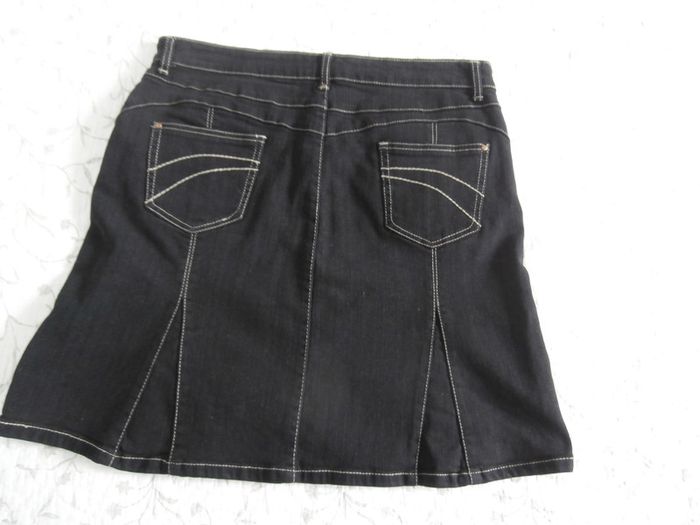 Jupe en jean's noire Taille 42 5 poches Jupe originale par sa coupe et son empiècement lui donnant un air évasée tout en restant presque droite Belle qualité Bonne tenue Largeur taille 42 Hauteur 50 Non fumeur