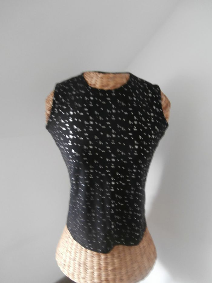 Haut / top /blouse / Tee shirt sans manches / débardeur Noir & Argent Taille: 38 / 40 Léger pas de repassage Effet garantie sur une jupe ou pantalon blanc Sans étiquette ( coupée) Hauteur : 58 cms Non fumeur