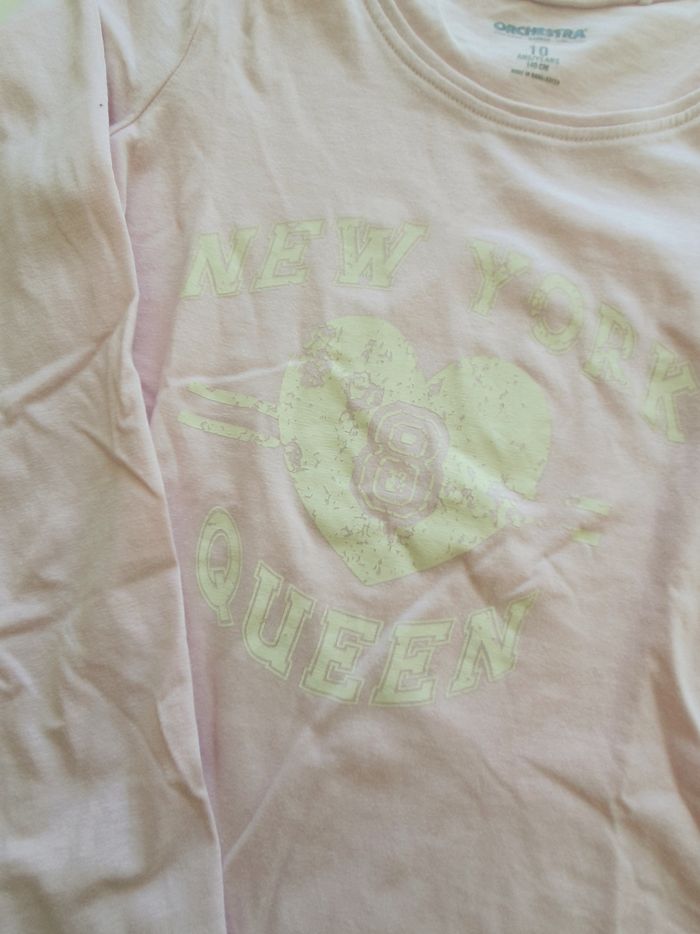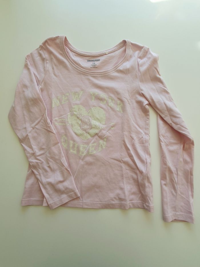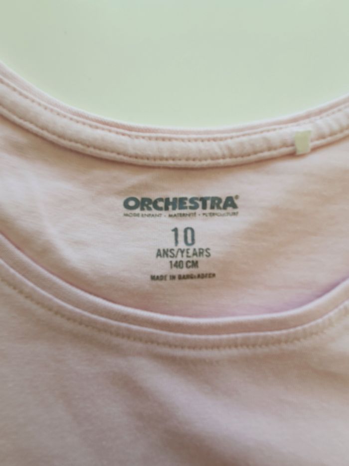 Tee-shirt Orchestra Taille 10 ans Coloris rose clair avec motif blanc Le motif a craquelé avec les lavages mais ça rend aussi bien Très bon état