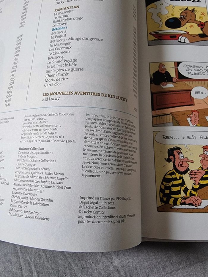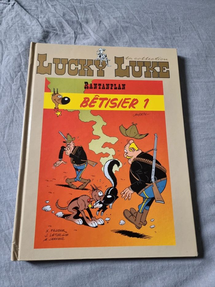 Luky Luke la collection bêtisier 1 Rantanplan En très bon état La petite histoire veut qu'un jour Morris en regardant à la télé un épisode de Rintintin, chien supérieurement intelligent, capable de sauver à lui tout seul un village d'une attaque indienne, eut l'idée de créer son exact contraire, Rantanplan, le chien le plus stupide de l'Ouest, incapable de donner la patte sans tomber. L'animal devint très vite une star du journal Spirou puis de Pilote, aimé au même titre que les Dalton, par des millions de lecteurs. Morris décida alors d'en faire le héros de gags en demi-page qu'il confia à Fauche, Léturgie et Janvier. Ces gags publiés notamment dans Télé Star eurent très vite un grand succès et les bêtisiers s'enchaînèrent. Après une interruption de quelques années, Rantanplan peut enfin renaître en album sous forme de Bêtisier avec des gags totalement inédits en album dans le cas du Bétisier 7 et dans une réédition pour le bêtisier 1. #angel_livre_enfant #angel_livre_adolescent_manga