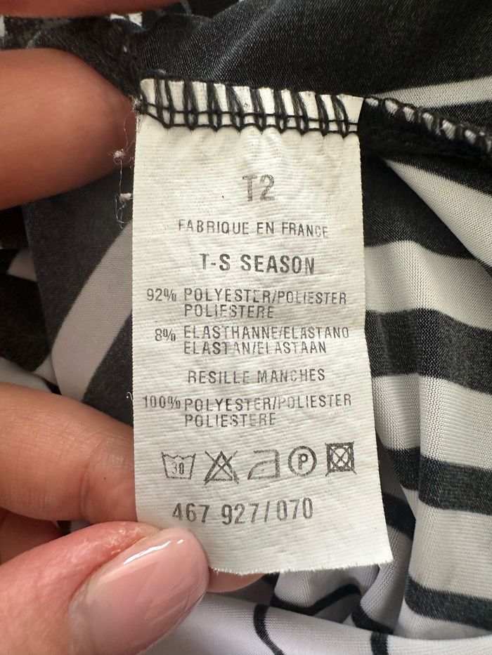 Blouse - Excellent état - Taille 2 équivalent 38 M - Marque Xanaka - Manches 3/4 en mesh - Col rond - Imprimés à rayures - Fabrication française 🇫🇷 - Polyester et élastane