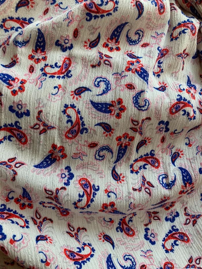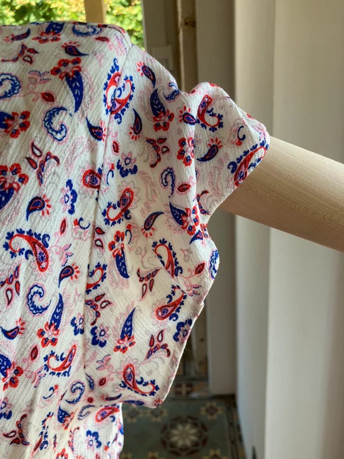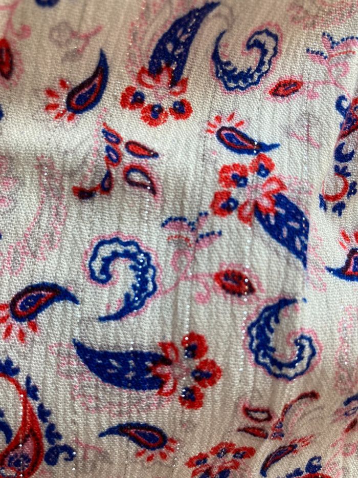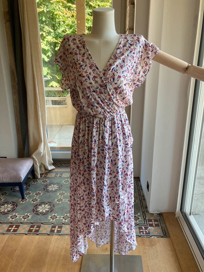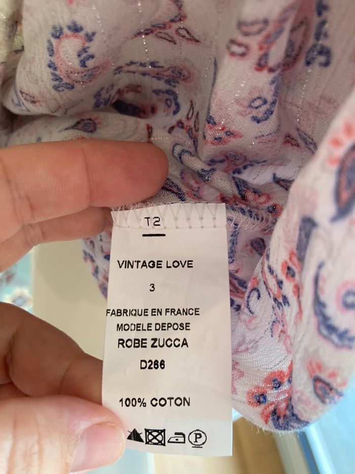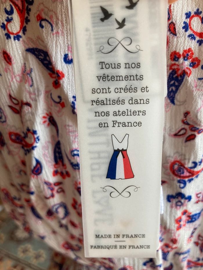 #mmmg_taille38 Fabriqué en France 100%coton Robe asymétrique plus courte sur le devant que sur le dos Modèle dépose robe zucca Manches volantées Elastiquée à la taille ou sous la poitrine selon le porté voulu Tissus léger et fluide imprimé thème provençal aux couleurs bleu rose rouge sur fond blanc lamellé argent Saison estivale Collection printemps été Prix d’achat 49€