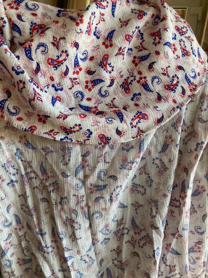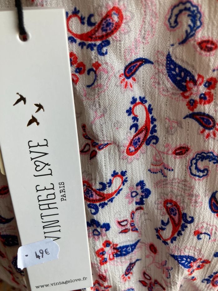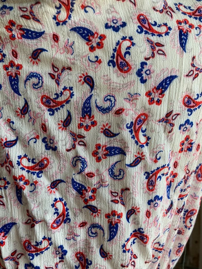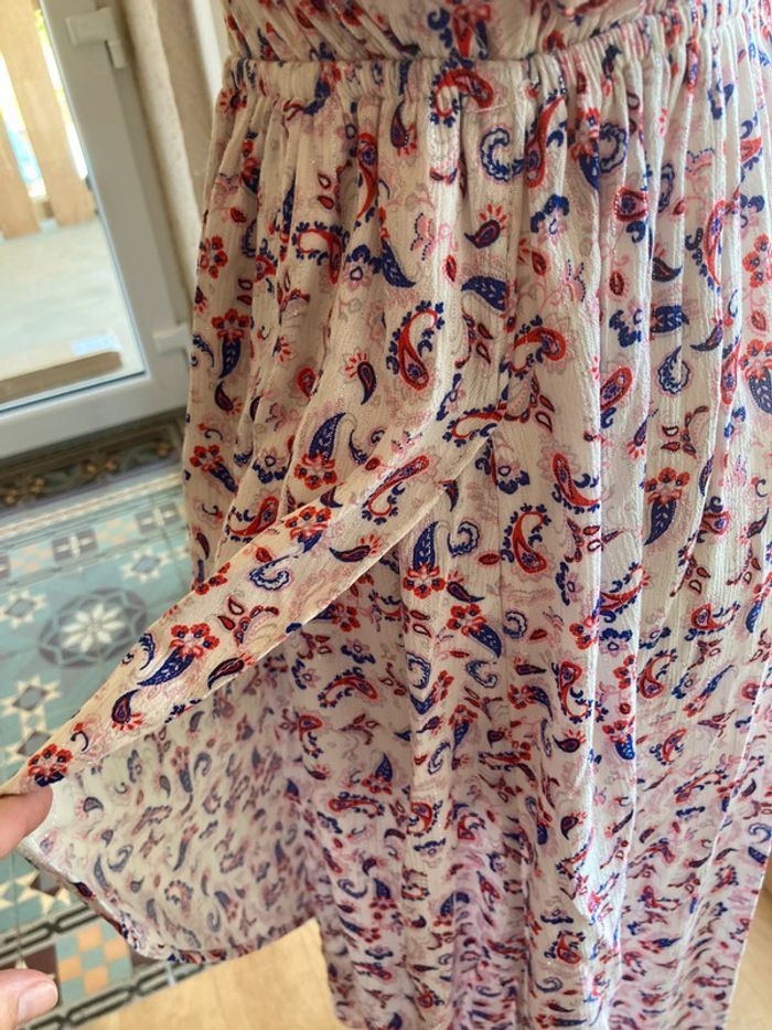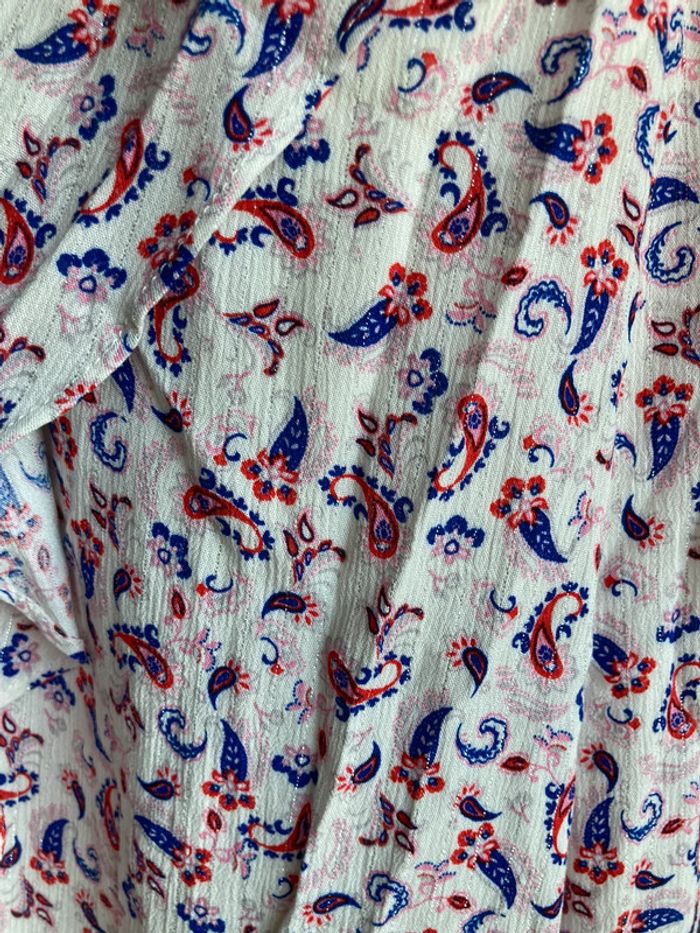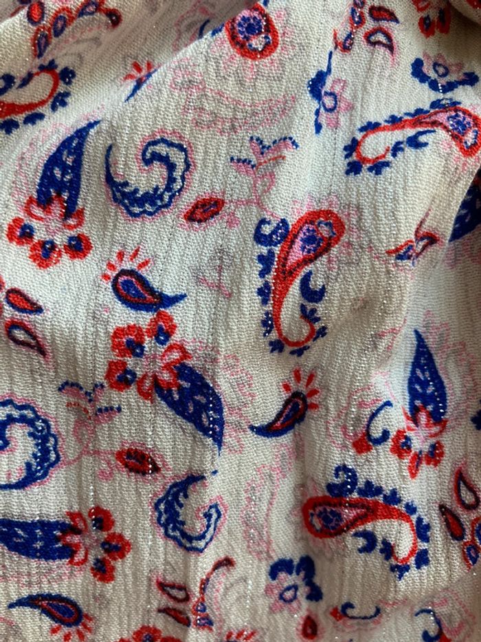 #mmmg_taille38 Fabriqué en France 100%coton Robe asymétrique plus courte sur le devant que sur le dos Modèle dépose robe zucca Manches volantées Elastiquée à la taille ou sous la poitrine selon le porté voulu Tissus léger et fluide imprimé thème provençal aux couleurs bleu rose rouge sur fond blanc lamellé argent Saison estivale Collection printemps été Prix d’achat 49€