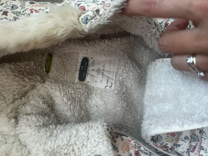 À été reprise entrejambe (cf dernière photo) mais reste en très bon état. Gants à mettre en revers pour laisser les petites mains à l’air.. Tape à l’œil