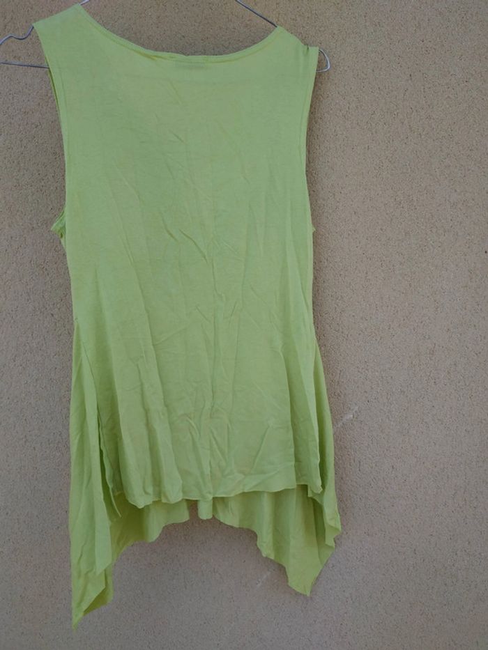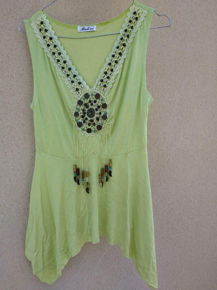 Joli débardeur à breloques. Porté mais en bon état. couleur vert anis plutôt que menthe. Achetez en lot pour bénéficier de prix intéressants.