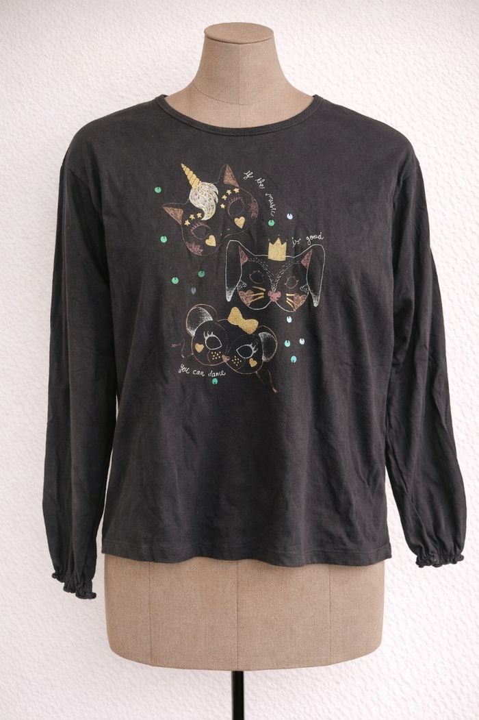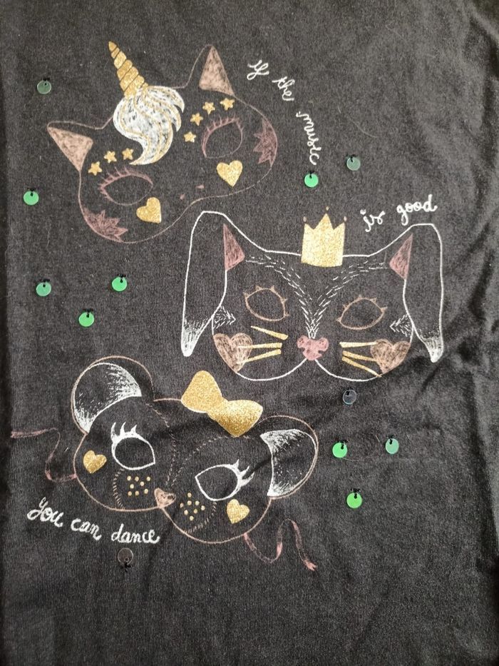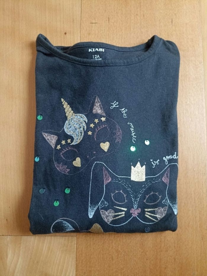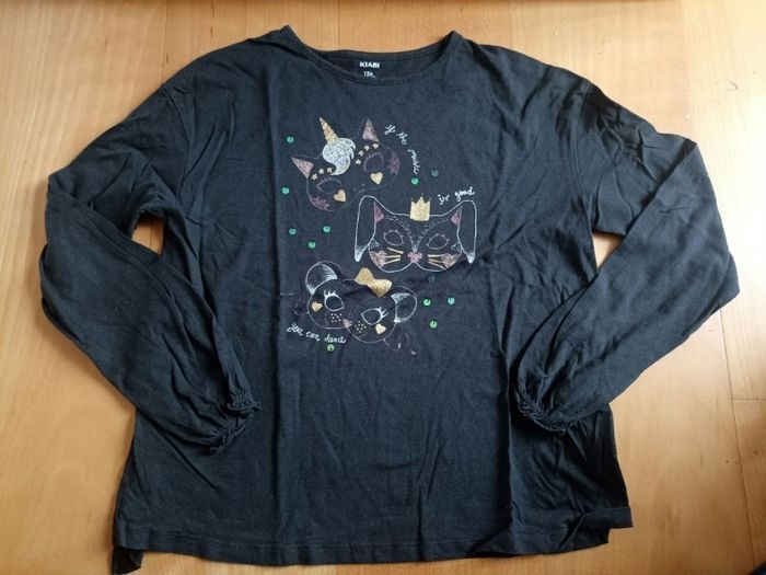 Tee-shirt manches longues fille 12 ans Gris foncé avec motif chat Très bon état Marque Kiabi