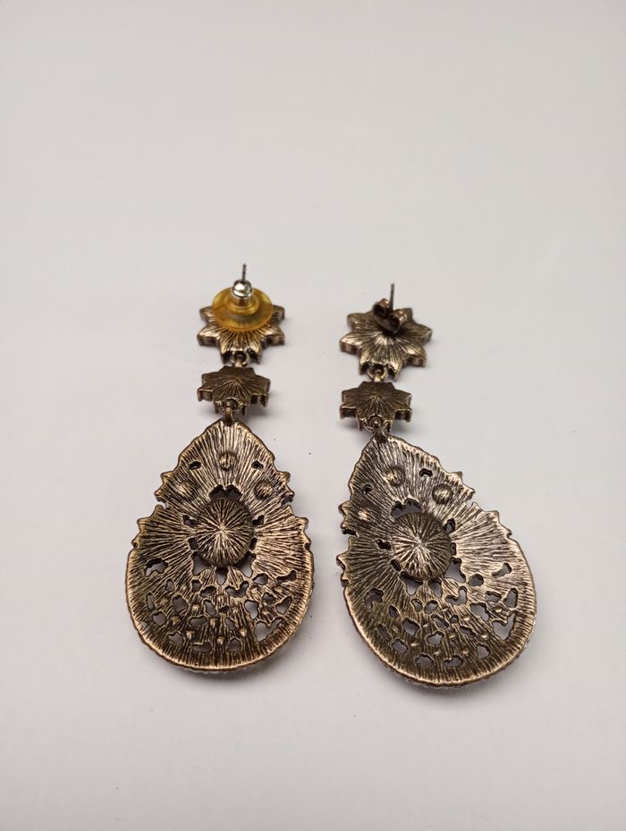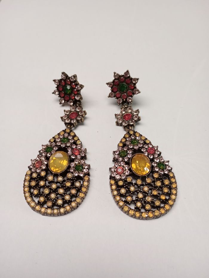 Boucles d'oreille dorées en forme de gouttes avec des pierres de plusieurs couleurs Longueur : 7,5 cm. Très bon état.