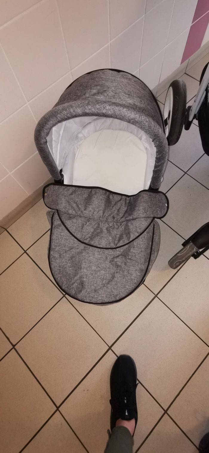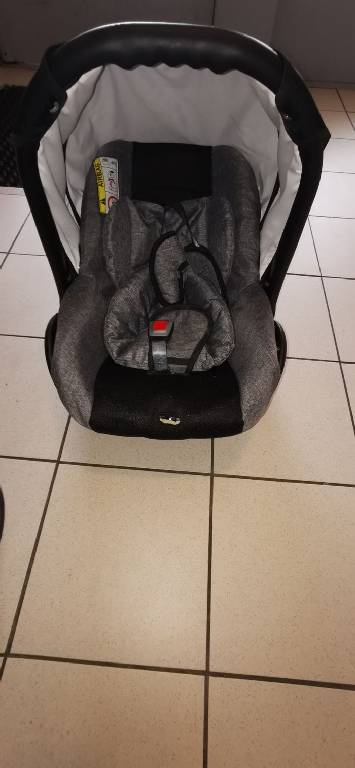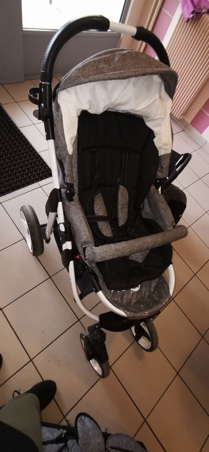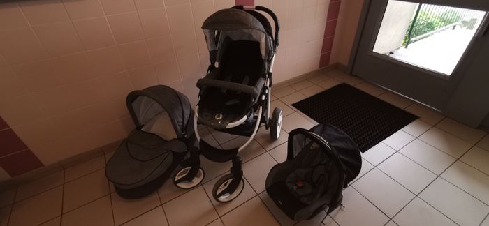 Poussette trio complète quatres roues. Nacelle, base poussette, assise pour plus grand, cosie. Avec protections pour froid et moustiquaires.