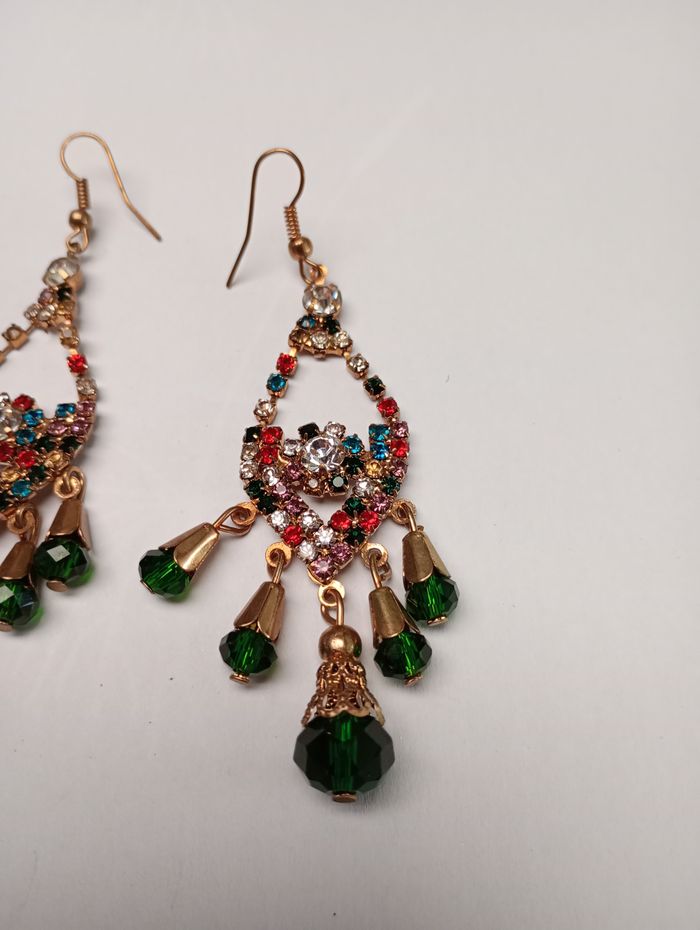 Boucles d'oreille dorées avec pierres de plusieurs couleurs. Longueur sans attache : 6,5 cm. Très bon état.