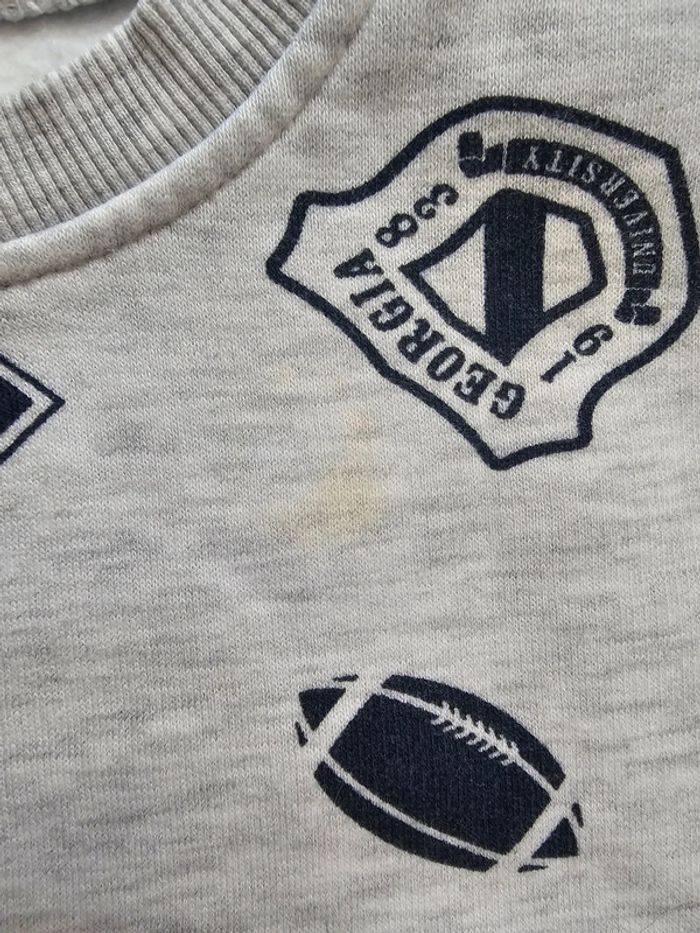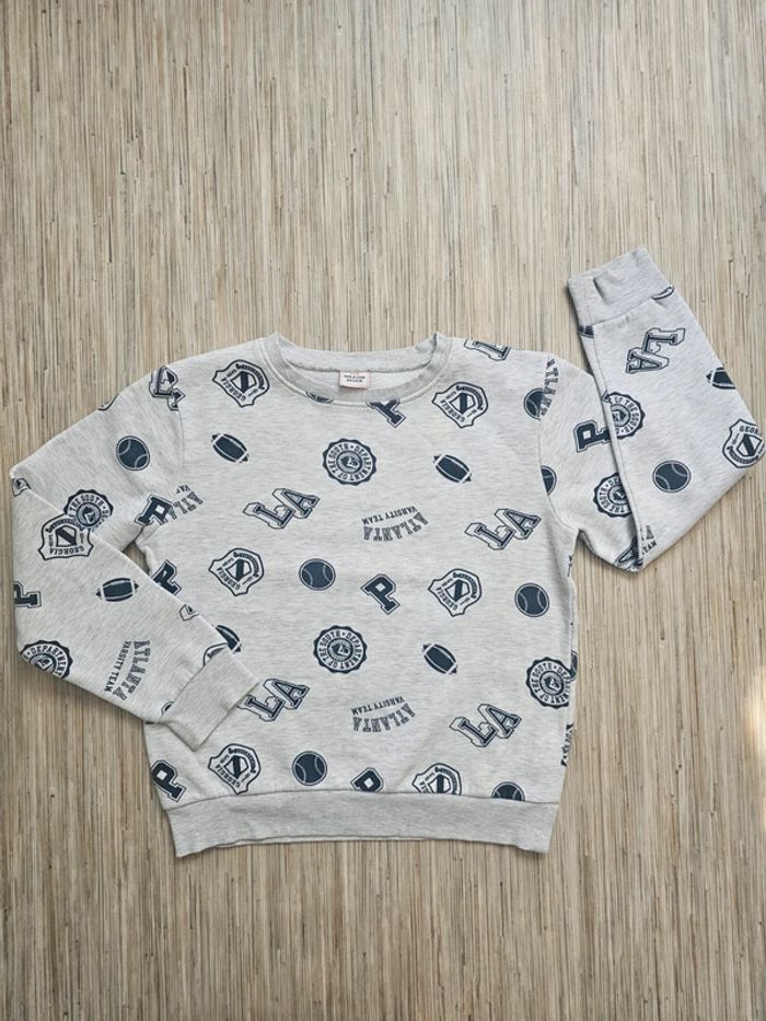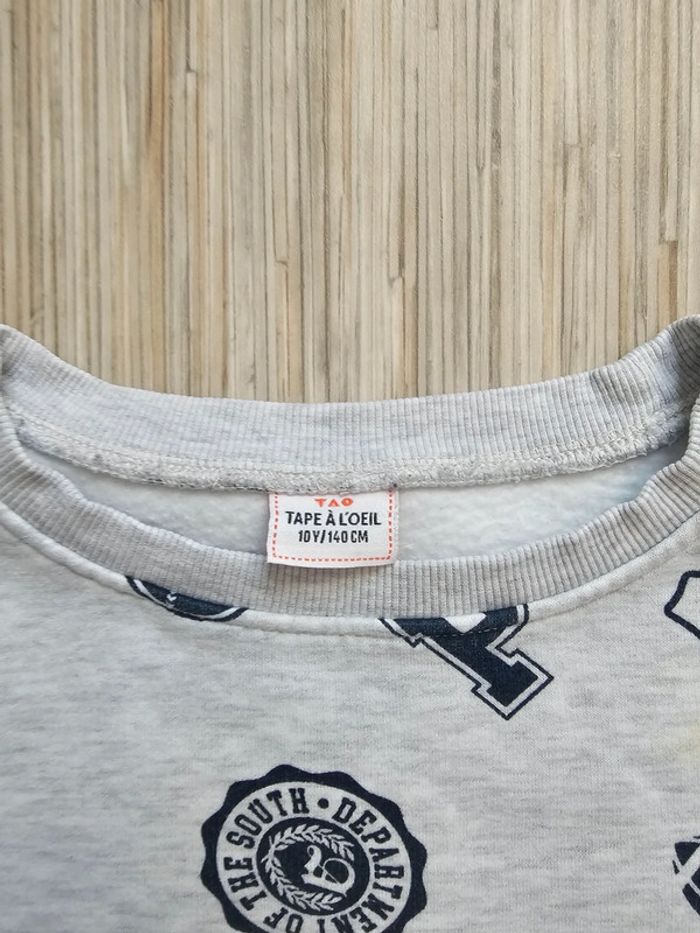 Sweat gris clair avec motifs bleu marine Tape à l'Oeil Taille 10 ans En bon état, il a une tâche près du col et au bout de la manche. Voir les photos.