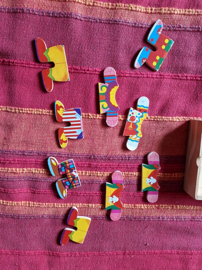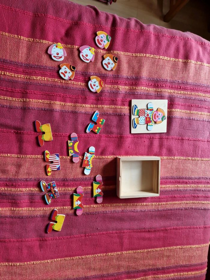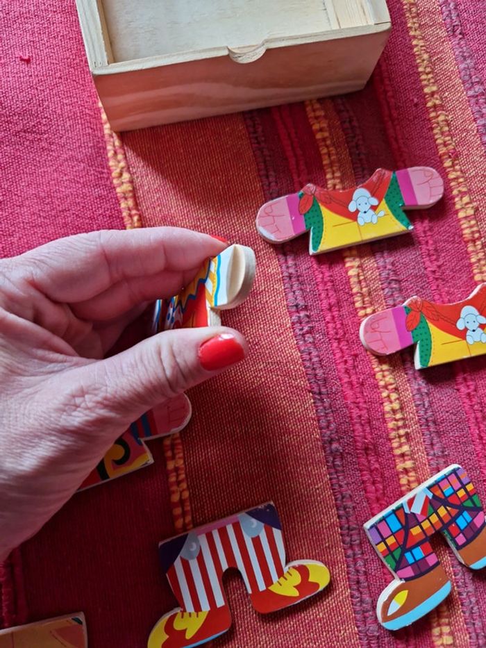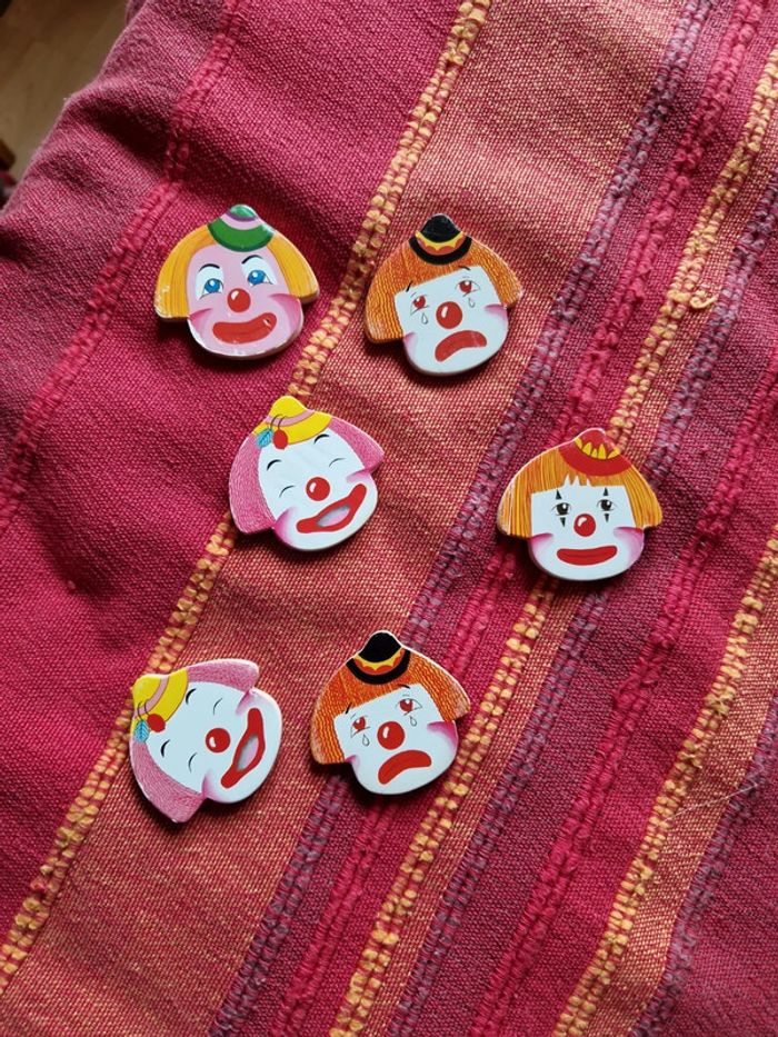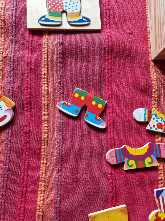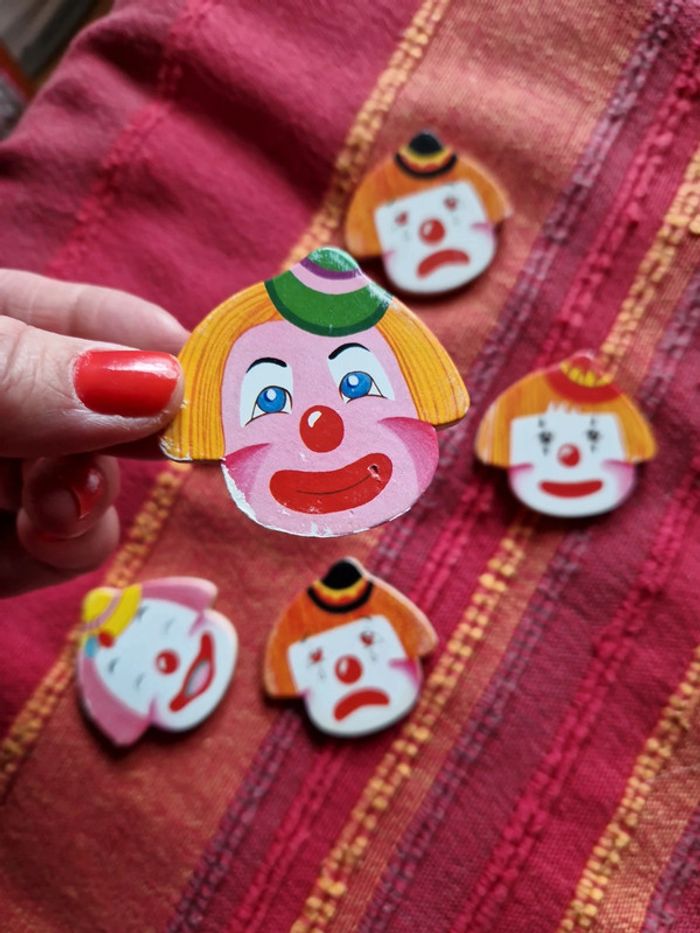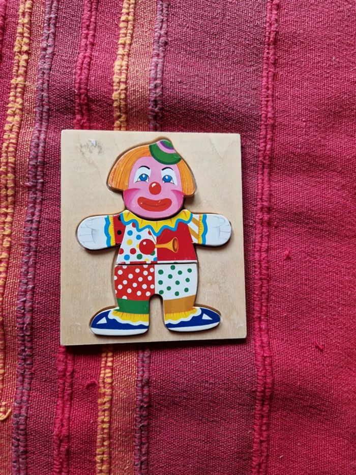 Jouet en bois clown changeable. Différentes têtes, de haut et de bas. En bon état