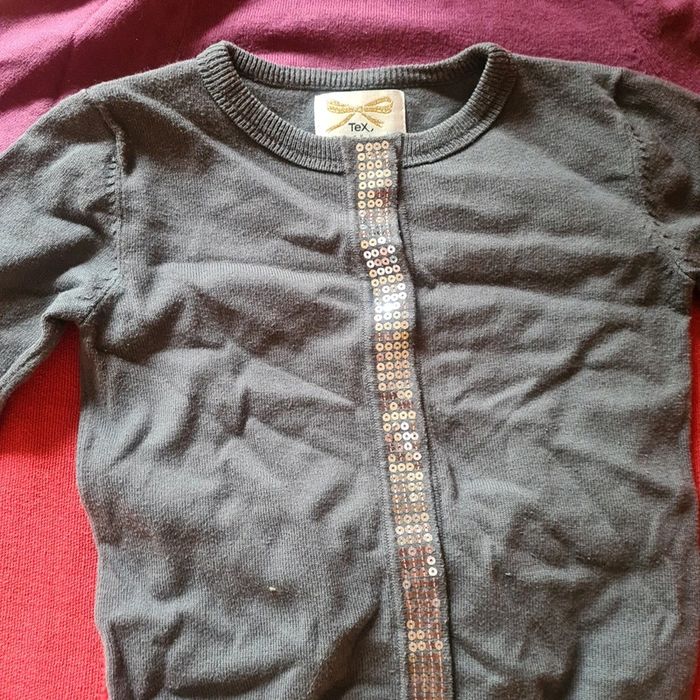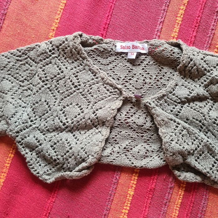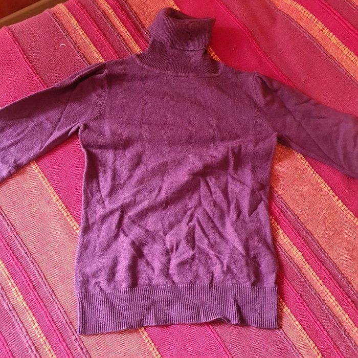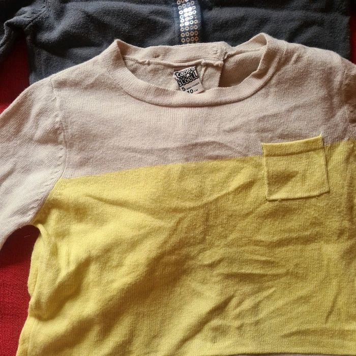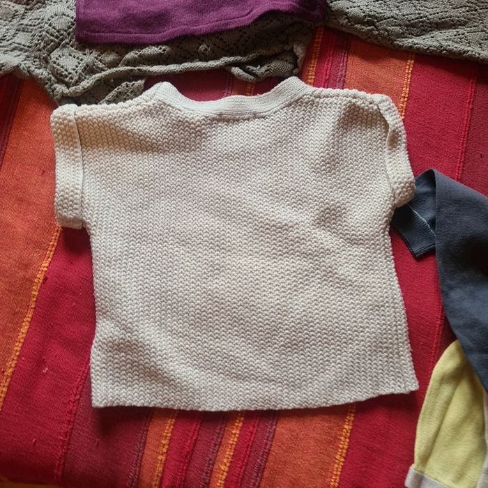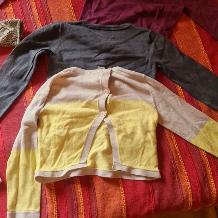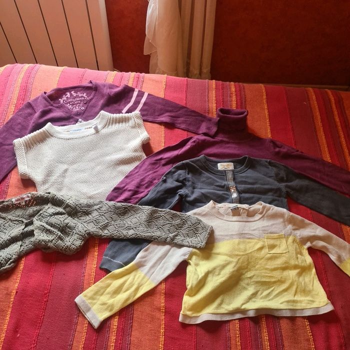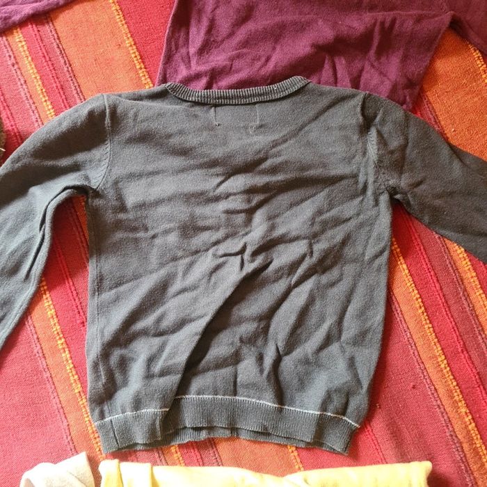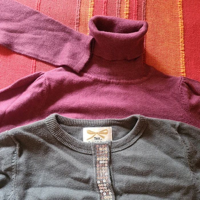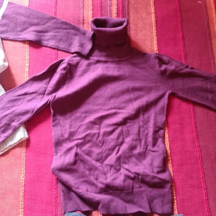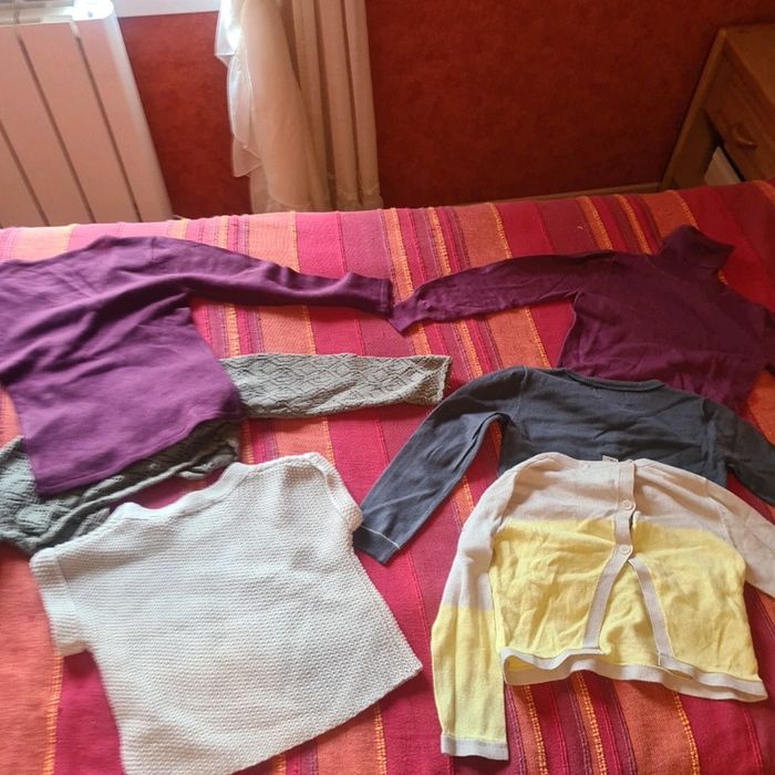 1 col roulé pourpre tex : neuf 1 gilet gris tex peu portée 1 pull pourpre complice : neuf 1 bolero kaki salso bamba 1 pull ouvert dos tape a l'œil : neuf 1 pull manches courtes okaidi : petite tâche