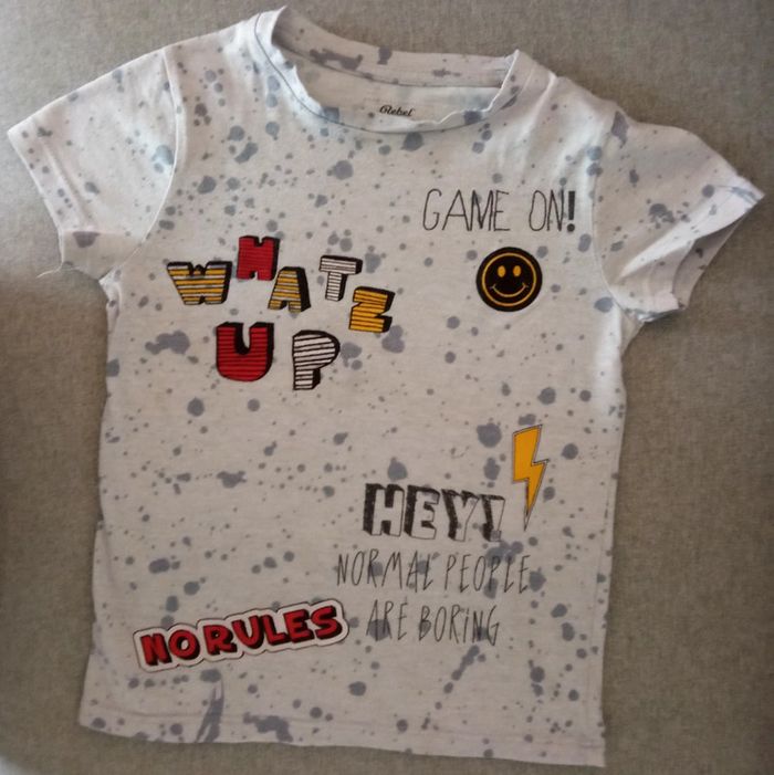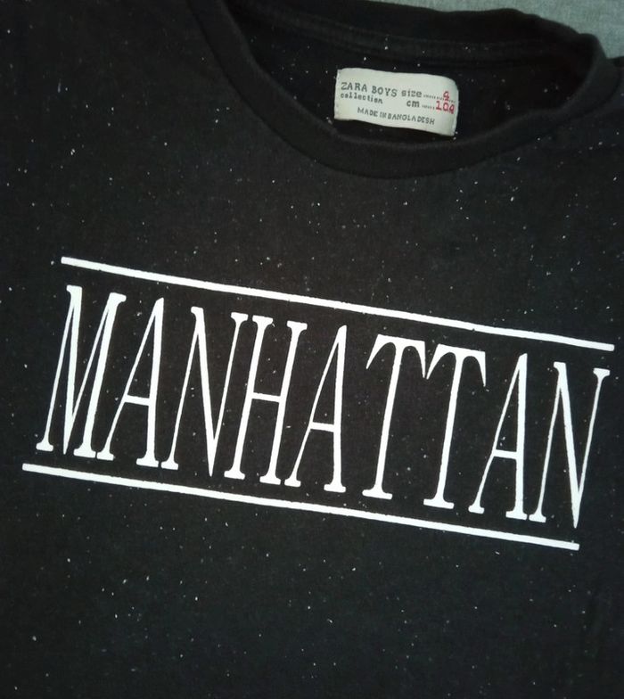 Lot composé de t-shirt manches courtes : - un t-shirt noir Manhattan, taille 4 ans, marque Zara boys - un t-shirt blanc avec motifs, taille 4-5 ans, marque Rebel by Primark - un t-shirt gris chiné avec motifs cactus 🌵, taille 2-4 ans, marque Lupilu - un t-shirt bleu uni, taille 2-4 ans, marque Lupilu - un t-shirt gris-noir, taille 4-5 ans, marque Rebel by Primark
