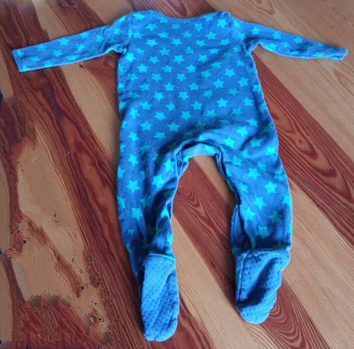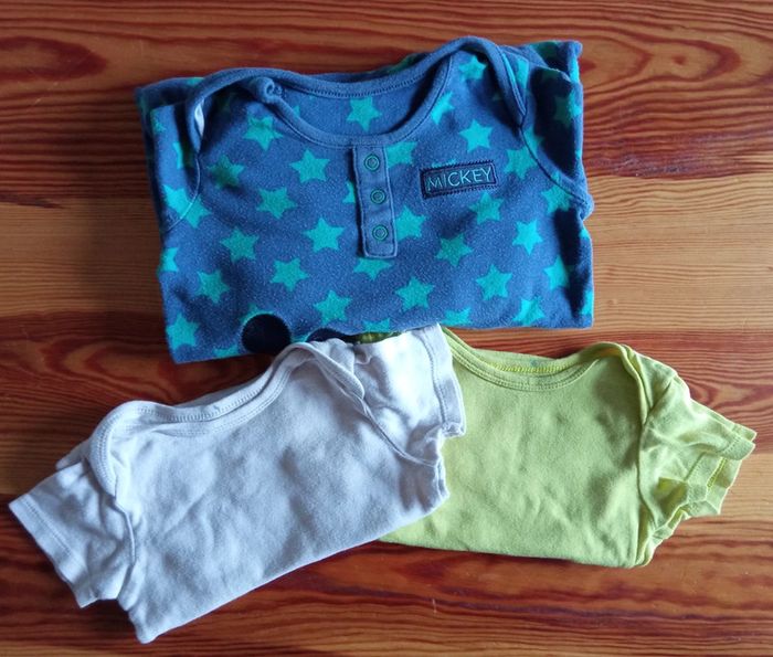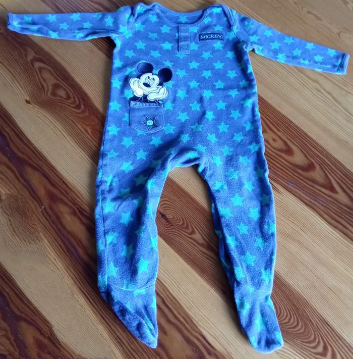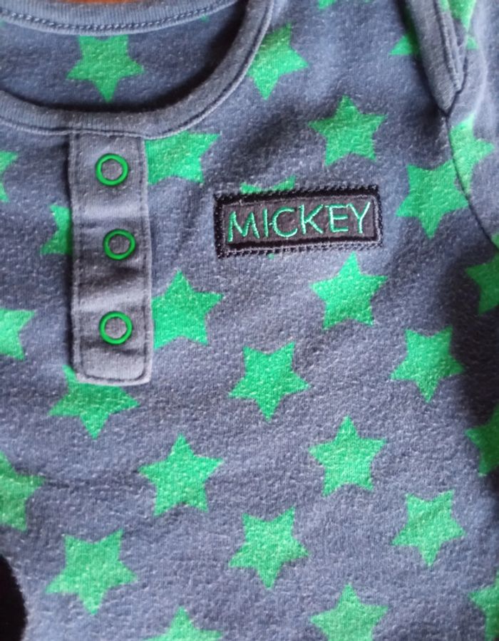 Lot composé de : - Un pyjama bleu marine étoiles verte motif Mickey, Marque Disney at George, taille 12-18 mois - un body beige - un body vert anis
