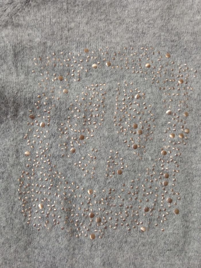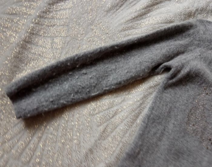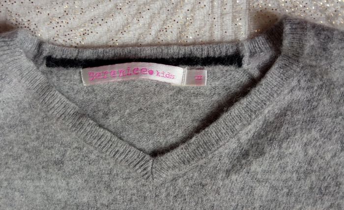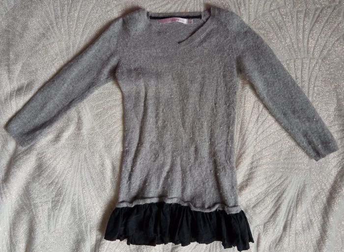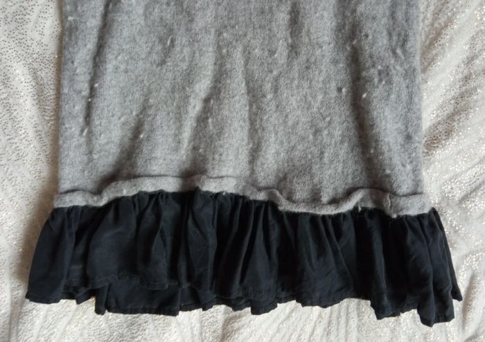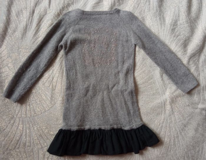 Robe pull gris en laine et bas noir en tissu, motifs au dos doré. Taille 8 ans, marque Bérénice Kids. Peluches à certains endroits.