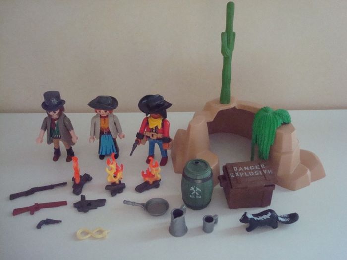 Véritable repaire des bandits avec 3 personnages, une caisse d'explosifs, un feu de camp, des pistolets et des fusils. Jouet complet en excellent état avec notice et boîte d'origine