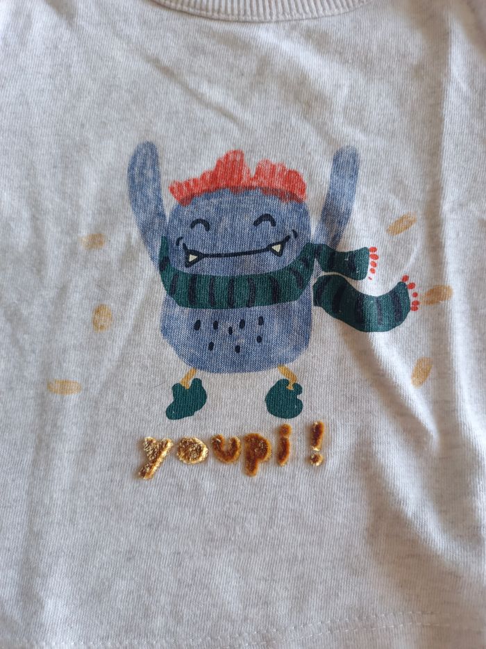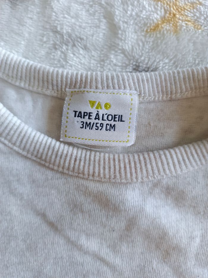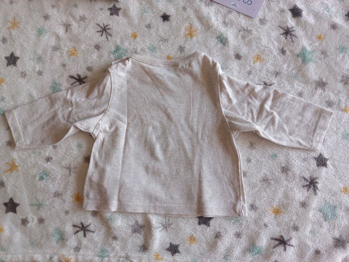 T-shirt à manches longues écru motif petit monstre. Tape à l'oeil, taille 3 mois. Porté 2 fois. 🐸 La peluche n'est pas à vendre 🐸 G46