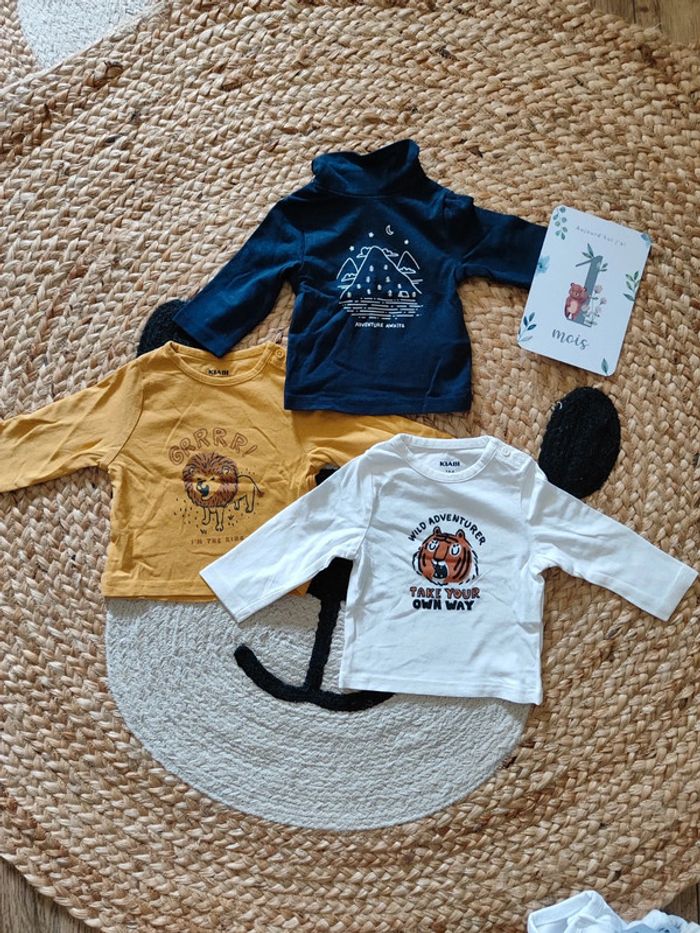 Lot de trois tee-shirts Kiabi Taille 1 mois Porté 1 ou 2 fois Etat impeccable N'hésitez pas à consulter mon dressing pour faire des lots ☺️