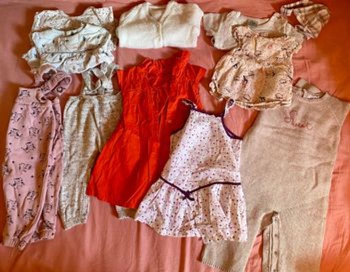 Marques variées (dpam, bout chou, Kiabi, Zara…) 2 tee shirt chemisette manches longues 1 tee shirt manches courtes 1 body manches courtes 2 robes manches courtes 2 salopettes jambes longues 1 combinaison légère 1 gilet 1 bandeau cheveux offert