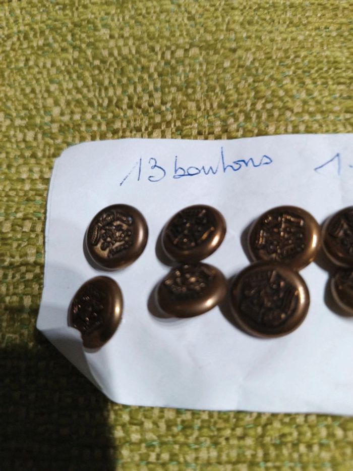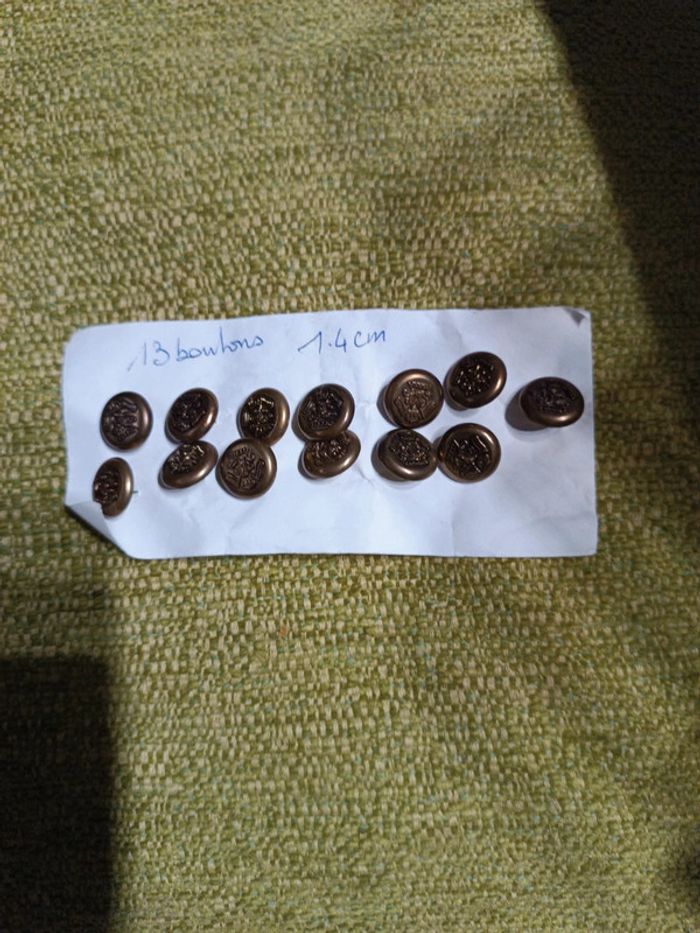Lot 13 boutons à coudre dorés 1.3 cm, décor armoiries, plastique façon métal. TBE